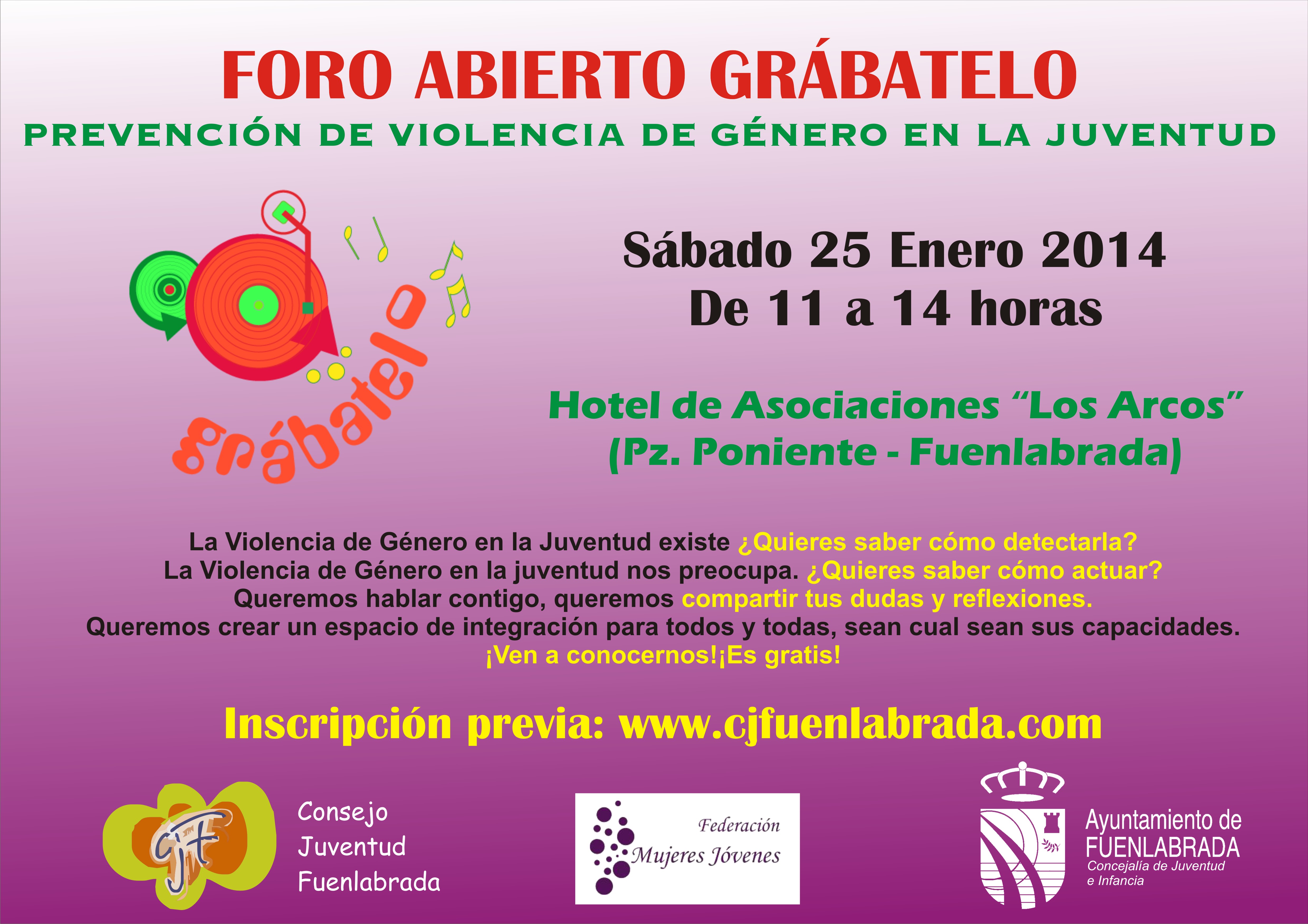 El próximo sábado 25 de enero el Consejo de la Juventud de Fuenlabrada y la Federación de Mujeres Jóvenes organizan un foro abierto que tratara sobre prevención de violencia de género en la juventud.