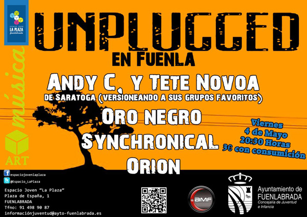 «Unplugged en Fuenla» – Viernes 4 de Mayo en el Espacio Joven La Plaza a partir de las 20:30h, destacando la participación de Andy C. y Tete Novoa de Saratoga que versionarán a sus grupos favoritos.