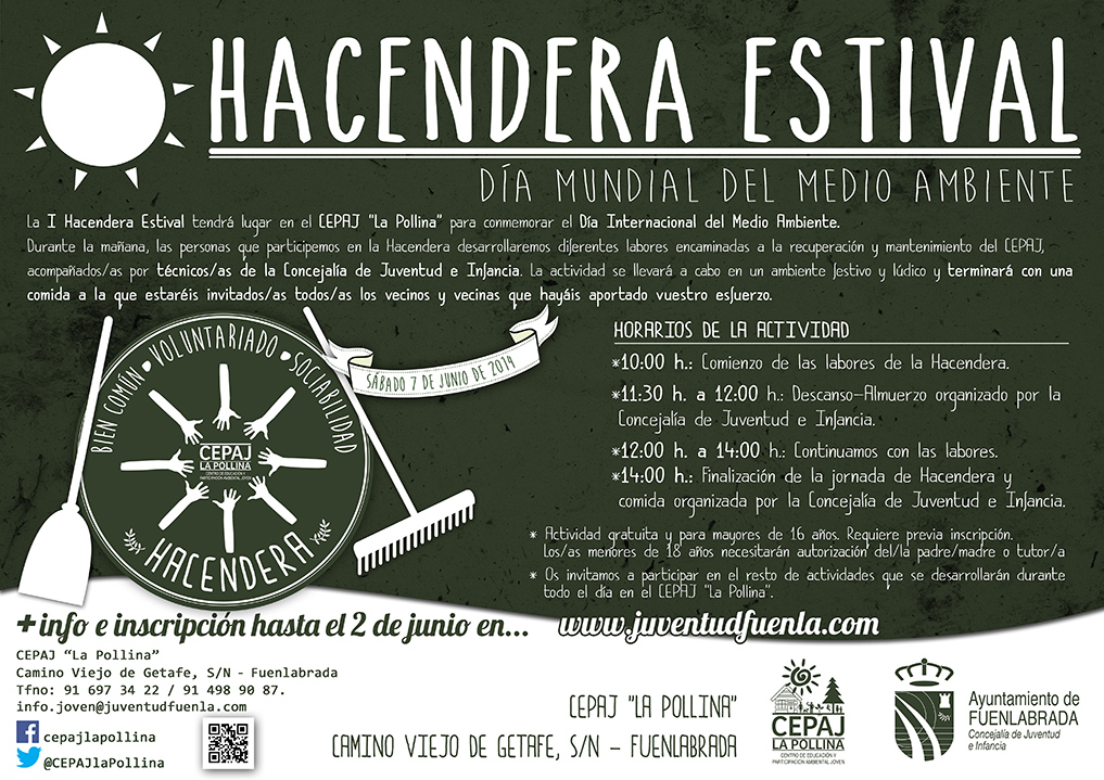 El próximo 7 de junio todos/as los/as vecinos/as de Fuenlabrada mayores de 16 años estáis convocados/as a participar en la I Hacendera Estival que tendrá lugar en el CEPAJ «La Pollina» para conmemorar el Día Internacional del Medio Ambiente.