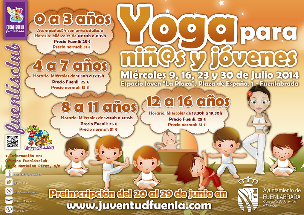 Las clases de yoga se desarrollarán los miércoles 9, 16, 23 y 30 de julio en el Espacio Joven «La Plaza» y trabajarán con los/as niños/as esta disciplina adaptándola a las edades de cada grupo de participantes, teniendo en cuenta la importancia de la estimulación motriz en edades tempranas, así como las posibilidades de movimiento de los/as niños/as, favoreciendo de esta forma el desarrollo integral del/la niño/a.