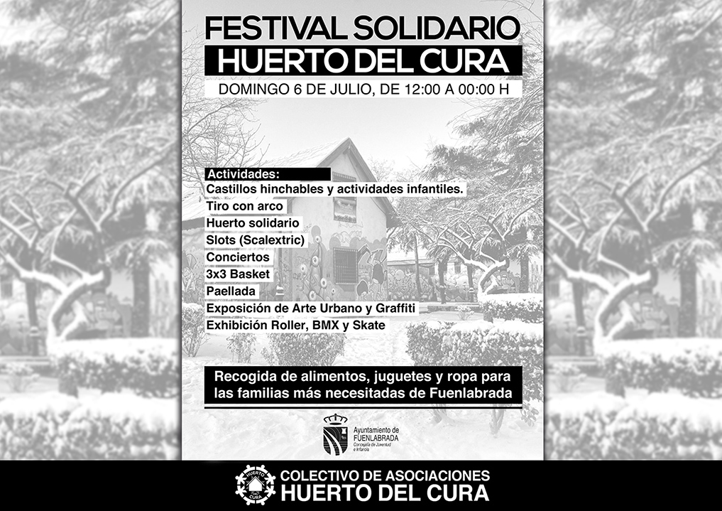 El próximo domingo 6 de julio a partir de las 12:00 de la mañana, el Colectivo de Asociaciones «Huerto del Cura« con la colaboración de la Concejalía de Juventud e Infancia, ha organizado una jornada de actividades con el fin solidario de recoger juguetes, ropa y alimentos para las familias más desfavorecidas de nuestra ciudad.
