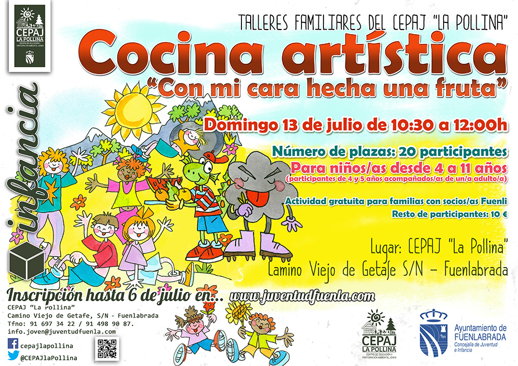 Ya puedes consultar si has sido admitid@ en el taller de cocina artística «Con mi cara hecha fruta» que desarrollaremos el próximo domingo 13 de julio de 10:30 a 12:00 horas en el CEPAJ «La Pollina».