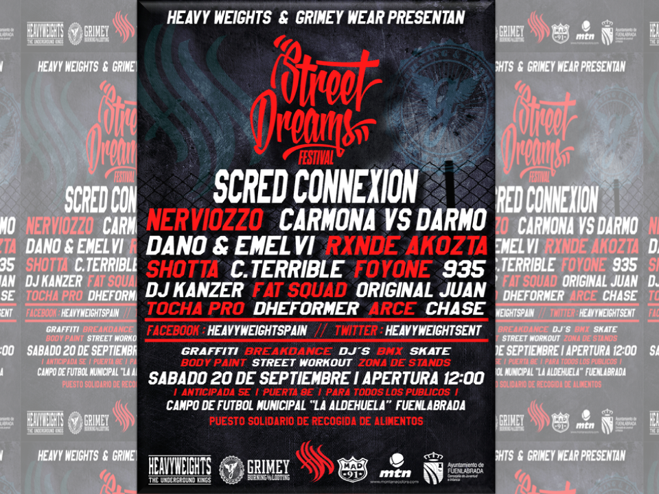 A las 18:00 horas darán comienzo los conciertos, los artistas que pisarán el escenario del Street Dreams Festival son los siguientes: Nerviozzo (Duo Kie) que presentará en exclusiva su álbum en solitario «Colapso Nerviozzo», Scred Connexion, grupo francés que actúa por primera vez en España, Carmona VS Darmo, Shotta, C.Terrible, Rxndy Akozta, Foyone, Fat Squad, Dheformer, Chase, Arce, Tocha Pro y Dj Kanzer.