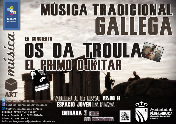 Viernes 18 de mayo a las 22:00 horas, Concierto de Música Tradicional Gallega en el Espacio Joven la Plaza con Os Da Troula y El Primo Ojkitar. Precio: 3 € con consumición.