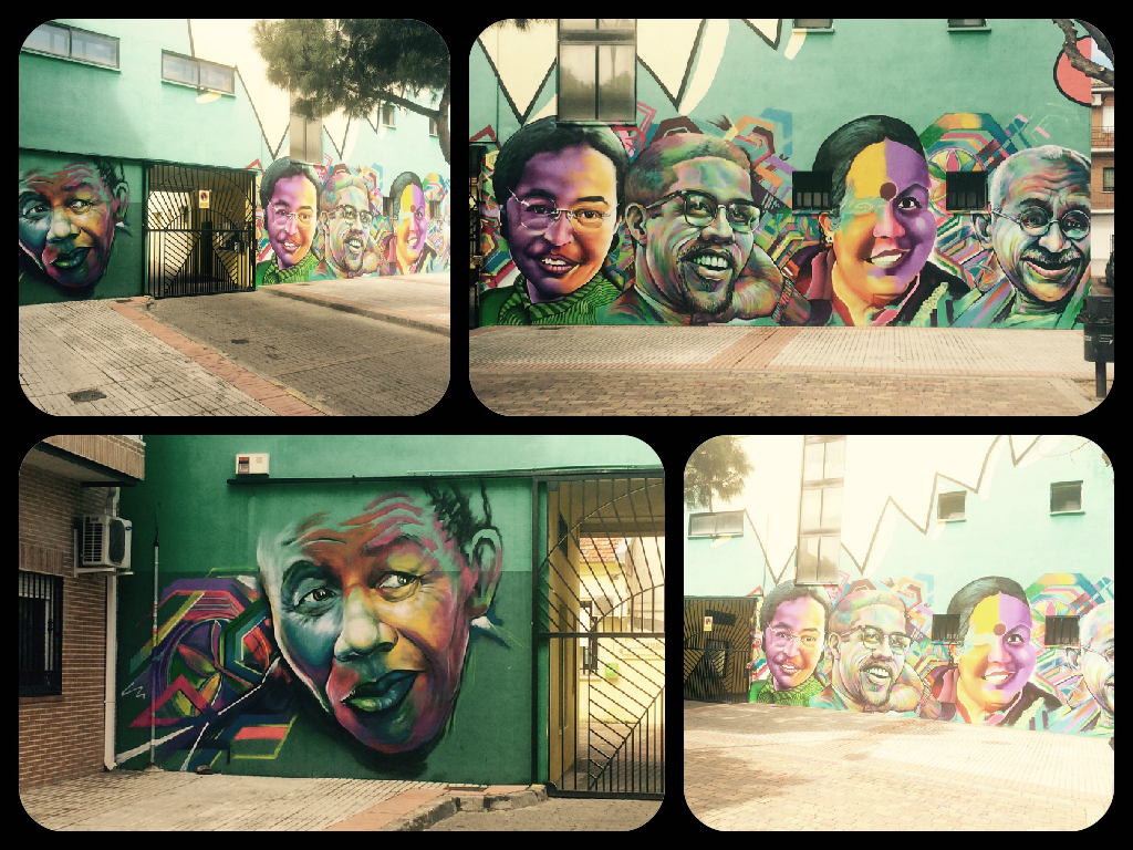 Esta iniciativa, desarrollada por el Ayuntamiento de Fuenlabrada, está enfocada a embellecer diferentes espacios de la ciudad a través del arte urbano. En la foto se puede comprobar el avanzado estado de los trabajos que los artistas El Mur y Bear Tck están desarrollando en la fachada del Espacio Asociativo «Los Arcos» rindiendo homenaje a importantes personajes de la historia contemporánea como Rosa Parks, Mahatma Gandhi, Vandana Shiva, Nelson Mandela y Malcolm X.