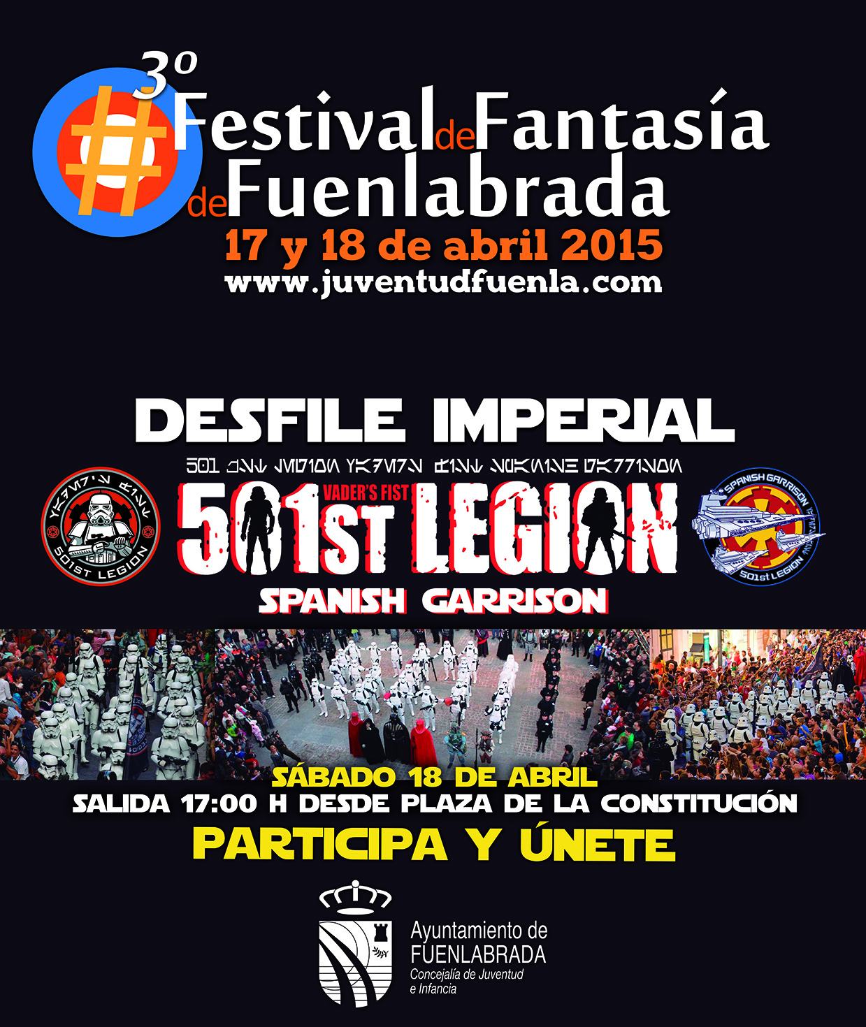 17:00 – 18:00: Desfile Imperial de la Legión 501 Spanish Garrison que participarán de forma solidaria recaudando fondos para la Casa Hogar Infantil de Fuenlabrada y que acercarán el universo Star Wars al FFF con una marcha que saldrá a las 17:00 horas del nuevo Ayuntamiento y concluirá en el Espacio Joven “La Plaza”.