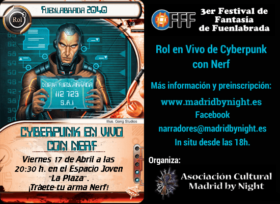 18:00 – 19:00: INSCRIPCIÓN E INFO ROL EN VIVO CYBERPUNK NERF FUENLABRADA 2040: apúntate y participa en esta partida de rol en vivo con armamento Nerf. Número de plazas limitadas. Organiza la Asociación Madrid By Night.