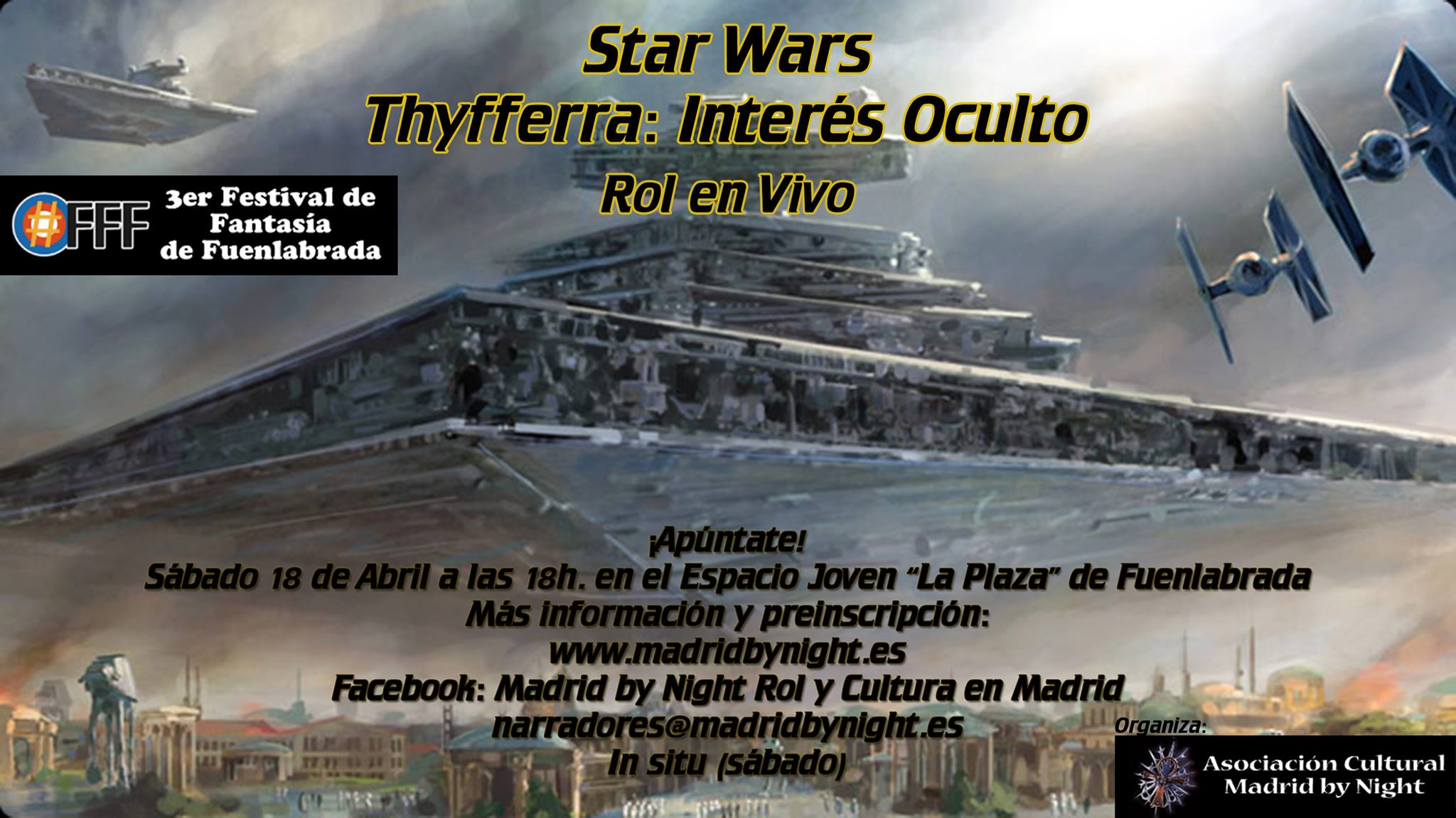 13:00 – 14:00: PUNTO DE ENCUENTRO E INFORMACIÓN ROL EN VIVO THIFFERRA: INTERÉS OCULTO: infórmate sobre cómo participar en esta partida de rol en vivo inspirada en el universo Star Wars. Organiza la Asociación Madrid By Night.