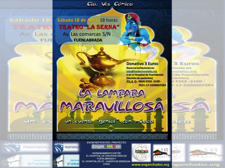 Para colaborar con este precioso proyecto os queremos invitar a asistir a la representación de la obra La lámpara maravillosa: un cuento «genial» con música, una historia que nos acerca a otras culturas y que seguro hará las delicias de los/as más pequeños/as, a la vez que les hará partícipes, a través de la aportación de 3€ por entrada, a la realidad que viven otros/as niños/as en otras partes del mundo (Chad en este caso). La representación se realizará gracias a la colaboración desinteresada de la Compañía Vis Cómica.