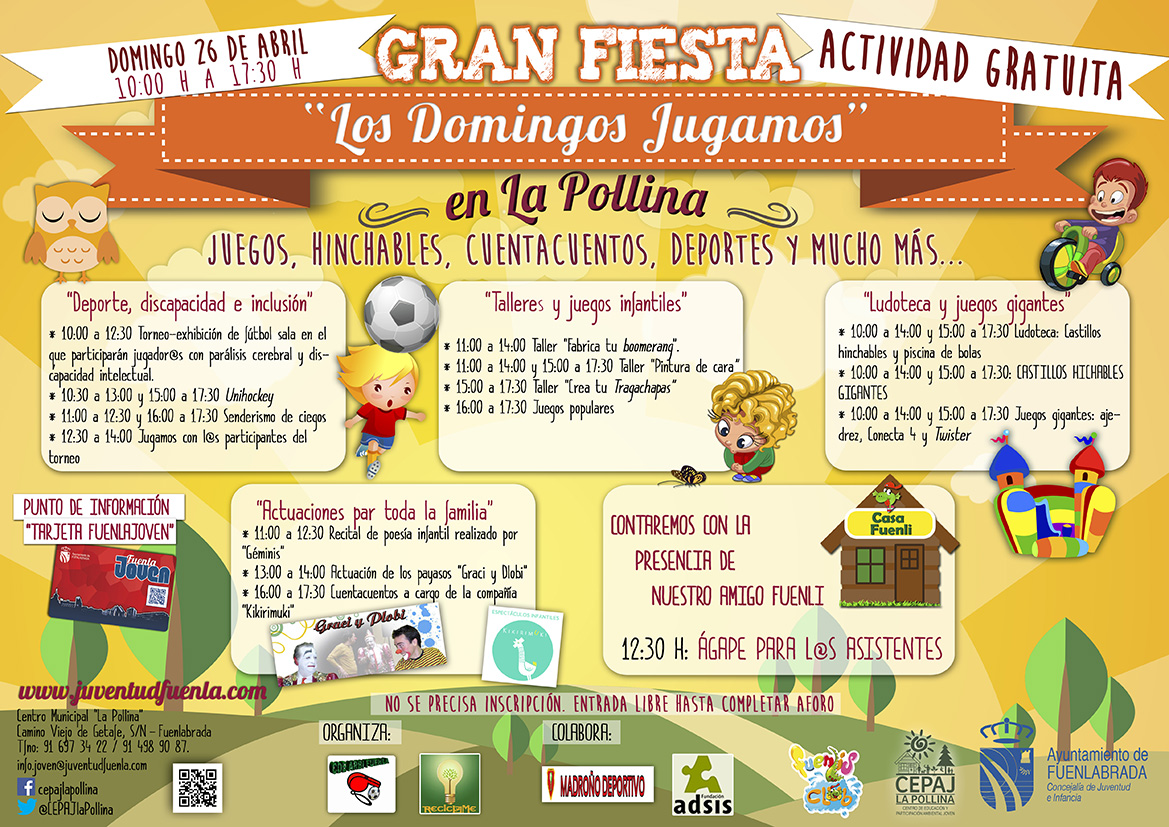 Durante los meses de marzo y abril, las instalaciones del Centro Municipal «La Pollina» han acogido un amplio programa de actividades familiares gratuitas que han abarcado el deporte, el reciclaje y los juegos populares. Para culminar este primer ciclo de actividades, las asociaciones organizadoras han preparado una gran fiesta dedicada a la discapacidad y la inclusión que contará con castillos hinchables, exhibiciones y campeonatos de deporte inclusivo, grandes juegos, cuentacuentos, poesía… Además, la Concejalía de Juventud e Infancia también estará presente en la fiesta con un estand en el que los/as jóvenes con edades comprendidas entre los 17 y los 35 años podrán tramitar la nueva Tarjeta FuenlaJoven y con la presencia de nuestra mascota Fuenli que se acercará a saludar a todos/as los/as vecinos que se congreguen en «La Pollina».