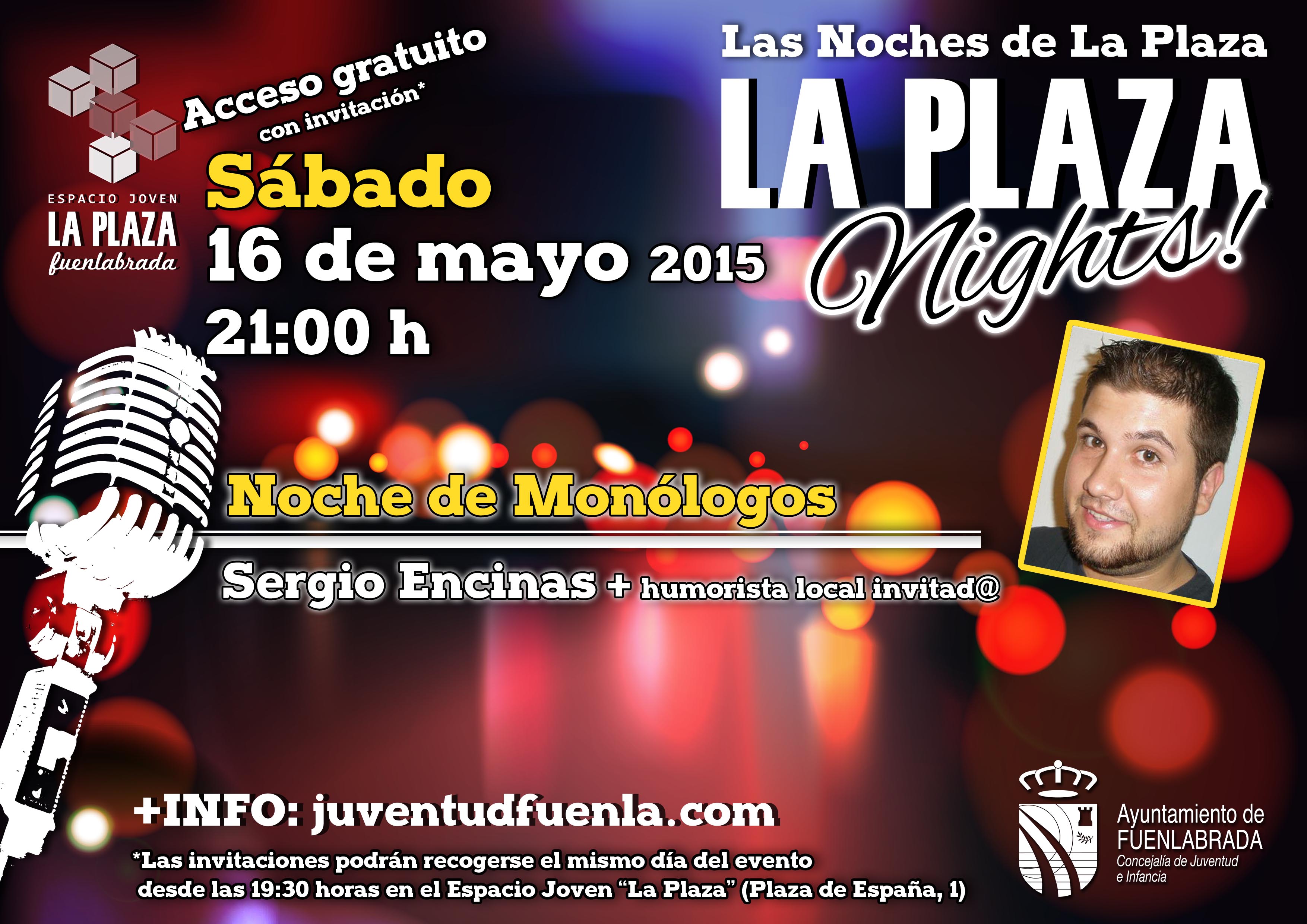El sábado 16 de mayo a partir de las 21:00 h. en el Espacio Joven «La Plaza», la última edición de Las Noches de la Plaza de esta temporada acoge una noche de monólogos con las actuaciones de Sergio Encinas y del monologuista local Jorge el Mullallo.
