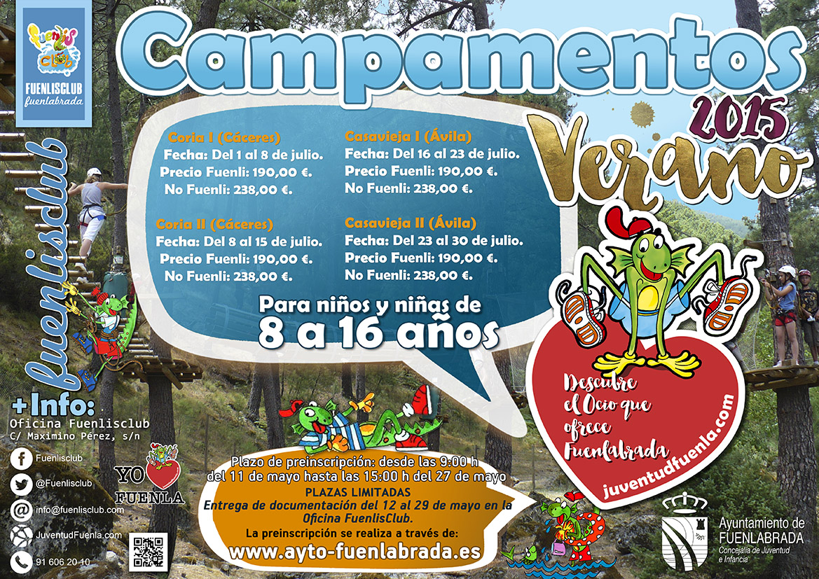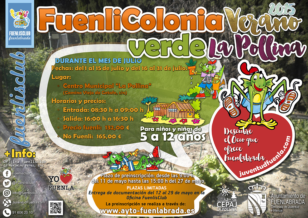 Las plazas que han quedado sin cubrir en los Campamentos y en la Fuenlicolonia Verde, podrán solicitarse a partir del 12 de junio por riguroso orden de llegada de manera presencial en la Oficina FuenlisClub (Espacio Joven «La Plaza» – C/Maximino Pérez S/N) en horario de 9:00 a 14:00 h y de 17:00 a 19:00 h. de lunes a viernes.