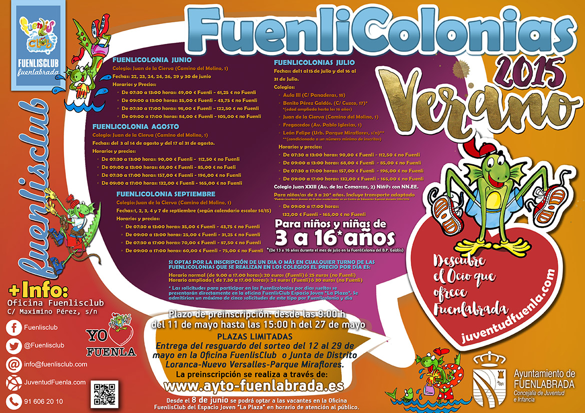 Las plazas que han quedado sin cubrir en el programa de Fuenlicolonias en colegios de Fuenlabrada, podrán solicitarse a partir del 8 de junio por riguroso orden de llegada de manera presencial en la Oficina FuenlisClub (Espacio Joven «La Plaza» – C/Maximino Pérez S/N) en horario de 9:00 a 14:00 h y de 17:00 a 19:00 h. de lunes a viernes. Los plazos tope de solicitud de vacantes varían en función de la Fuenlicolonia que se quiera solicitar, son los siguientes: