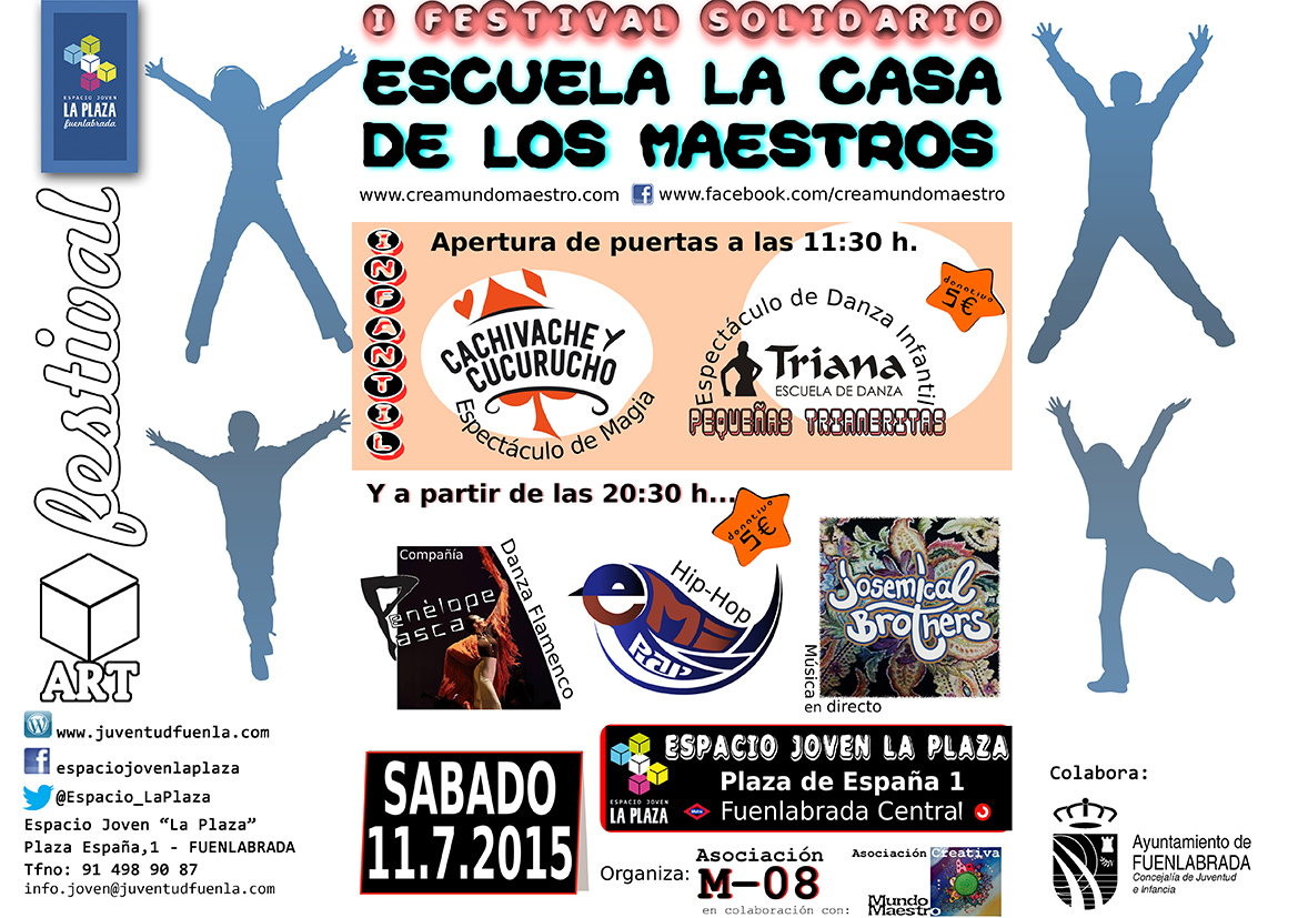 El próximo sábado 11 de julio el Espacio Joven «La Plaza» acoge el I Festival Infantil Solidario: Escuela «Casa de los maestros». La actividad se divide en dos bloques, el primero por la mañana dirigido al público infantil y el segundo por la noche dirigido a jóvenes.
