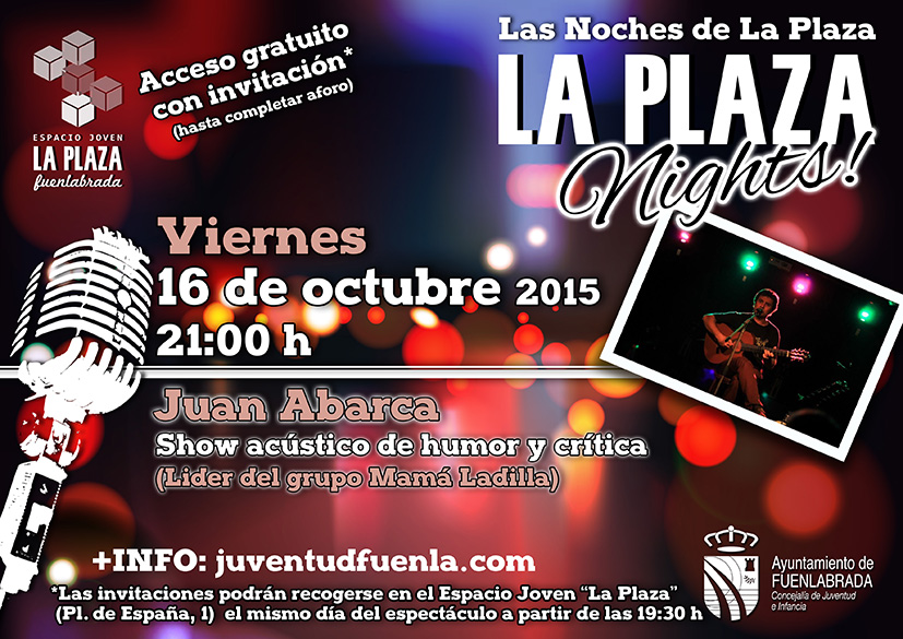 Con el show de Juan Abarca comienza la nueva temporada de La Plaza Nights, programa cultural que acogerá durante los fines de semana conciertos, obras de teatro, sesiones de monólogos y diferentes espectáculos que vienen a sumarse a la amplia oferta cultural que se desarrolla en la red de teatros de la ciudad. El objetivo de esta iniciativa de la Concejalía de Juventud e Infancia es la de ofrecer a l@s jóvenes fuenlabreñ@s una nueva alternativa de ocio basada en una programación cultural de calidad.