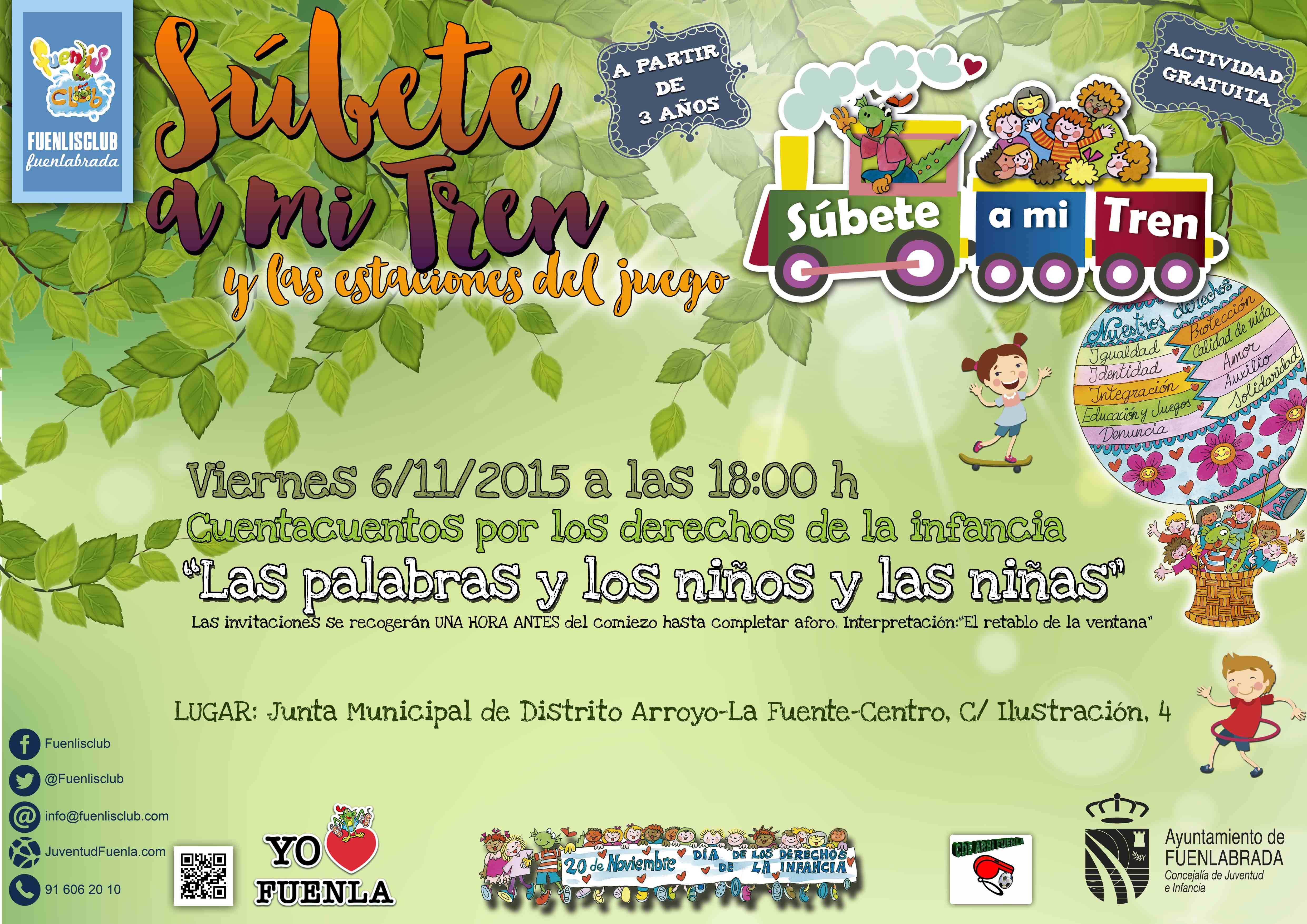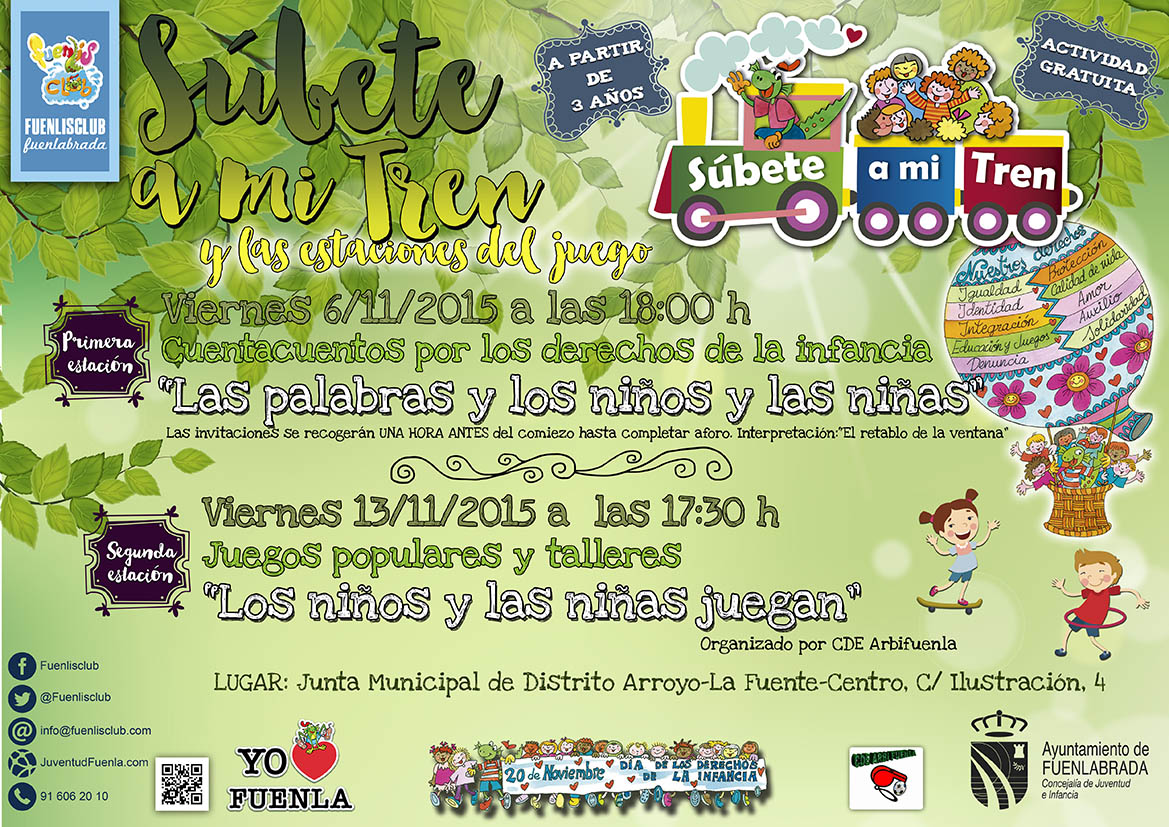 “Súbete a mi tren” es un programa de la Concejalía de Juventud e Infancia del Ayuntamiento de Fuenlabrada dirigido a niños, niñas y sus familias, que tiene como objetivo de ofrecer actividades de carácter participativo y cultural que combinen la diversión y el disfrute con la educación en valores y la sensibilización a través de la dinamización de espacios de referencia para la infancia de la ciudad (parques, barrios, colegios etc.). Este programa lo componen distintos vagones cargados de contenidos que simbólicamente se han ido desplazando por la ciudad a lo largo de todo el año, con más de 30 representaciones durante 2015.
