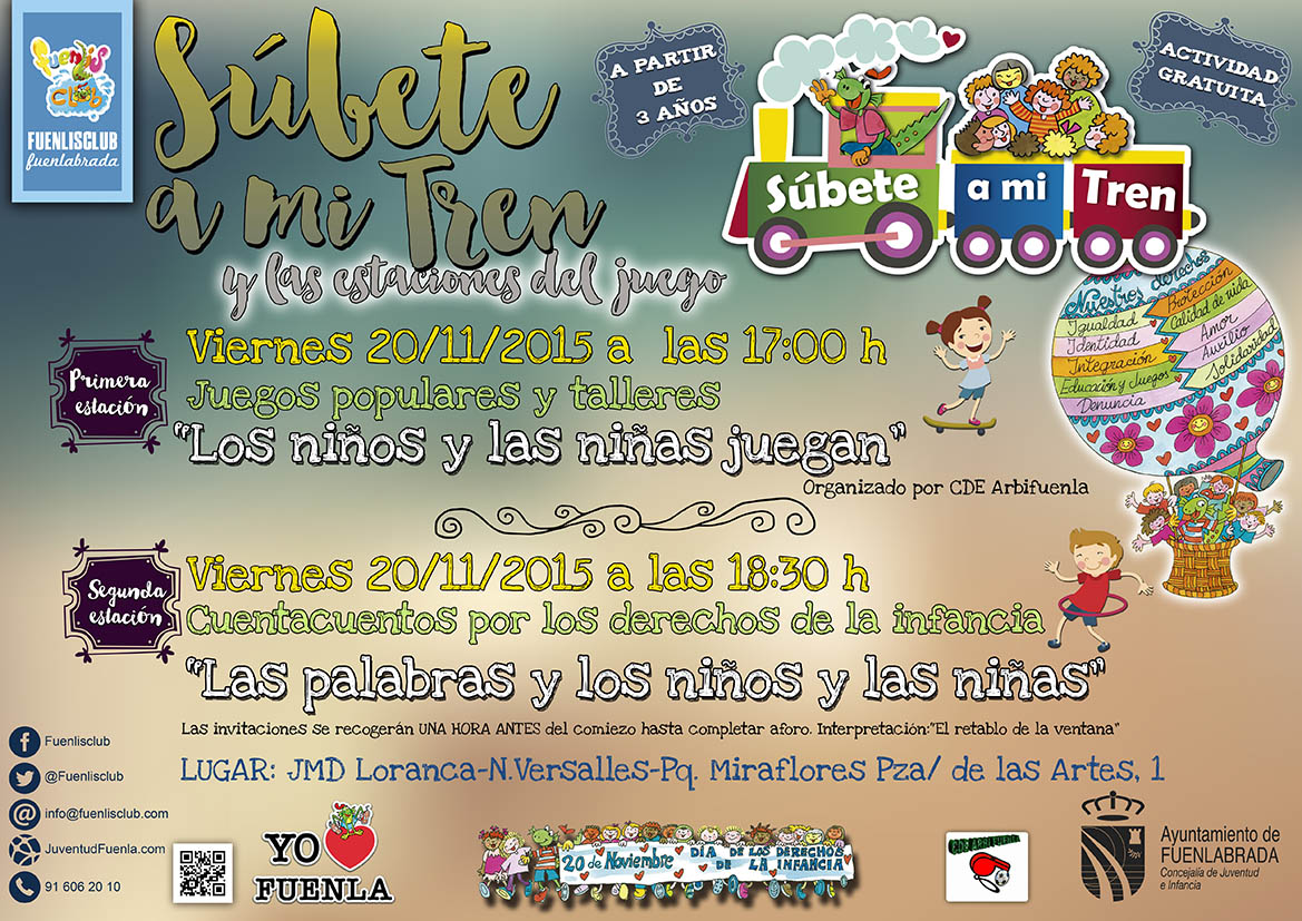 “Súbete a mi tren” es un programa de la Concejalía de Juventud e Infancia del Ayuntamiento de Fuenlabrada dirigido a niños, niñas y sus familias, que tiene como objetivo de ofrecer actividades de carácter participativo y cultural que combinen la diversión y el disfrute con la educación en valores y la sensibilización a través de la dinamización de espacios de referencia para la infancia de la ciudad (parques, barrios, colegios etc.). Este programa lo componen distintos vagones cargados de contenidos que simbólicamente se han ido desplazando por la ciudad a lo largo de todo el año, con más de 30 representaciones durante 2015.