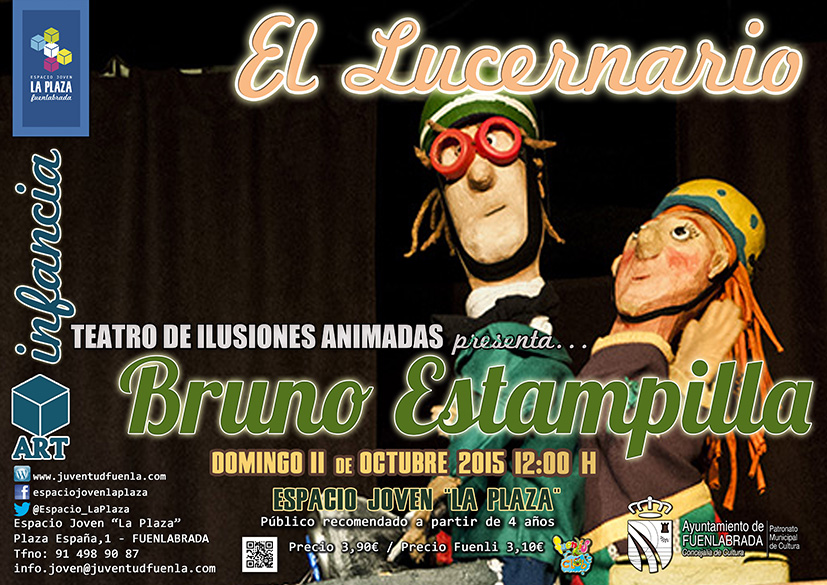 El domingo 11 de octubre a las 12:00 h. una nueva edición de El Lucernario nos acerca al Espacio Joven «La Plaza» la obra de teatro de títeres «Bruno Estampilla» de la Compañía Teatro de Ilusiones Animadas.