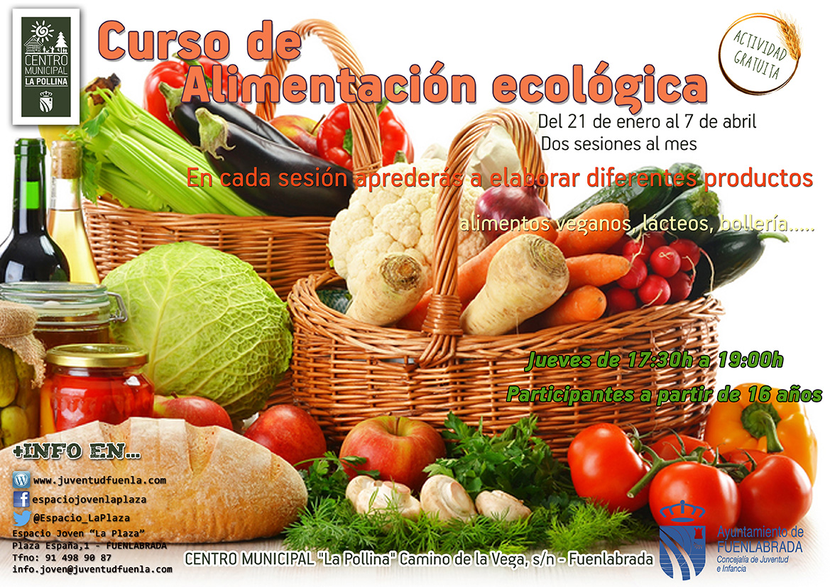 Desde el 21 de enero al 7 de abril se impartirá este curso centrado en conocer y aprender a elaborar productos alimenticios ecológicos que tendrá lugar en el Centro Municipal La Pollina los jueves de 17:30 a 19:00h (dos jueves al mes). En cada una de las sesiones se elaborarán diversos productos alimentos veganos, bollería, lacteos, etc.