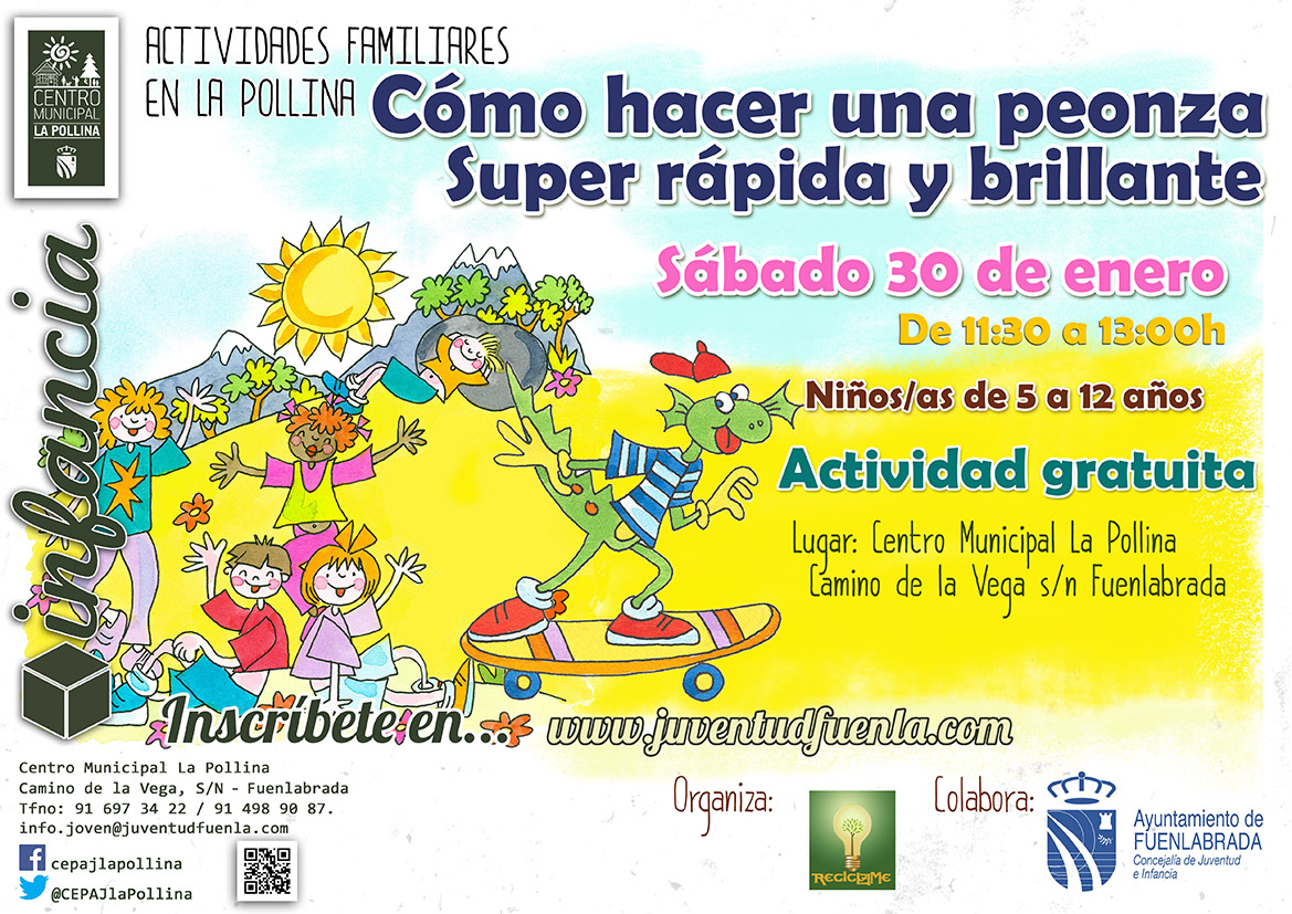 La actividad está dirigida a niños y niñas de 5 a 12 años y dará comienzo a las 11:30 h. A lo largo de la mañana los/as participantes realizarán una peonza con materiales reciclados. Además los/as niños/as podrán estar acompañados/as por un adulto/a.