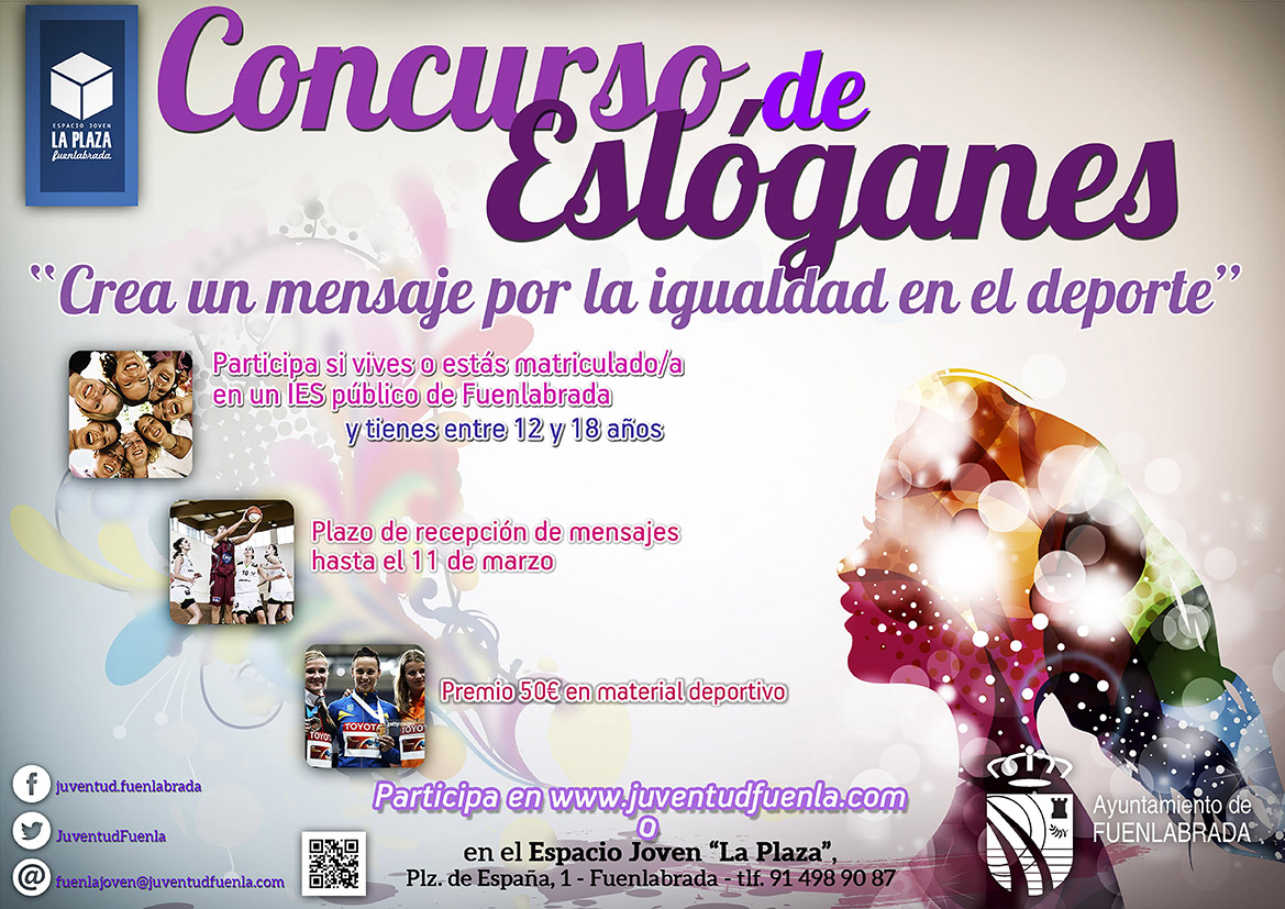 Dentro de la programación de actividades del Ayuntamiento de Fuenlabrada en conmemoración del 8 de marzo – Día Internacional de la Mujer -, la Concejalía de Juventud e Infancia propone un concurso de eslóganes bajo el título » Crea un mensaje por la igualdad en el deporte» dirigido a adolescentes de 12 a 18 años. ¡Participa. Puedes ganar 50€ en material deportivo!.