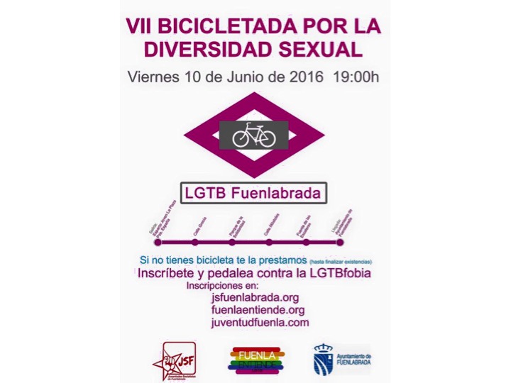 El próximo viernes 10 de junio a las 19:00 h, la asociación juvenil Fuenla Entiende LGTB, junto a las Juventudes Socialistas de Fuenlabrada y el Ayuntamiento, organizan la VII edición de la Bicicletada por la Diversidad Sexual.