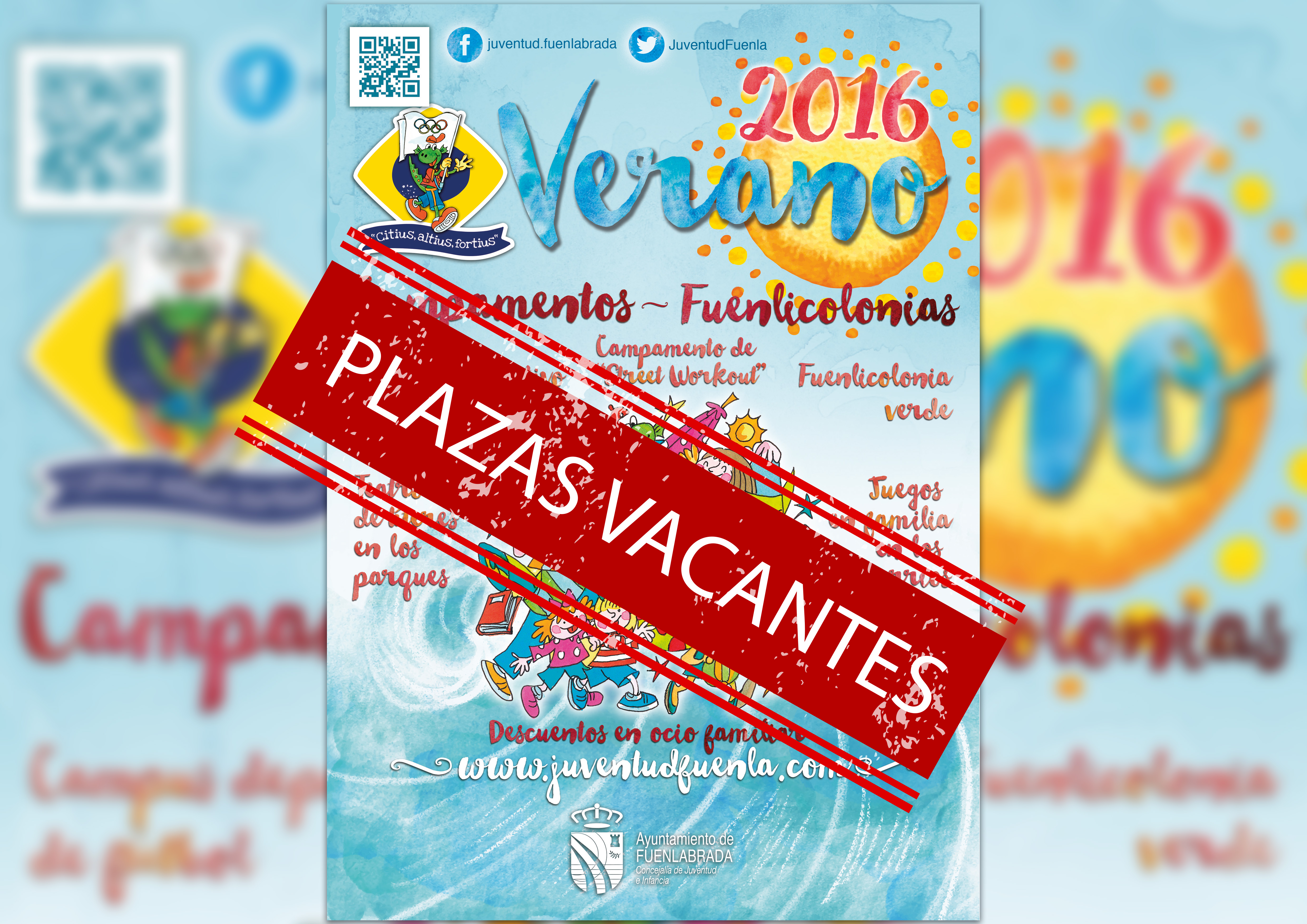 Los/as vecinos/as que no realizasteis la solicitud para las actividades de la Campaña de Verano 2016 de la Concejalía de Juventud e Infancia en el plazo ordinario, tenéis la posibilidad de acceder a las plazas que han quedado vacantes; éstas se asignarán por riguroso orden de llegada y deben solicitarse de manera presencial en la sede de FuenlisClub (Espacio Joven “La Plaza”- C/Maximino Pérez S/N) en horario de lunes a viernes de 9:00 a 14:00 h. y de 17:00 a 19:00 h. hasta el 30 de junio y de 9:00 a 14:30 h. en los meses de julio y agosto.