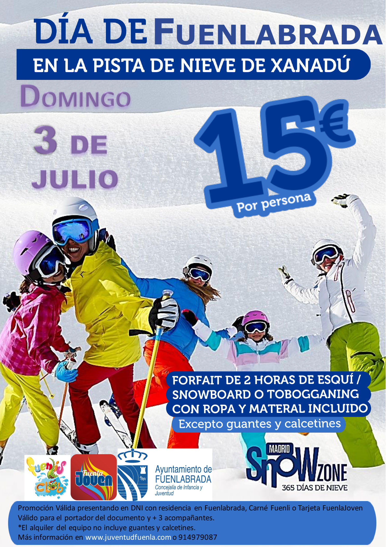 Durante ese día con sólo presentar el Carné Fuenli, la Tarjeta FuenlaJoven o el DNI (en cuyo caso, como lugar de residencia deberá aparecer Fuenlabrada) la persona que acredita ser del municipio y hasta 3 acompañantes, podrán conseguir el forfait de 2 horas de esquí, snowboard o tobogganing con ropa y material incluido al precio único de 15 euros por persona.