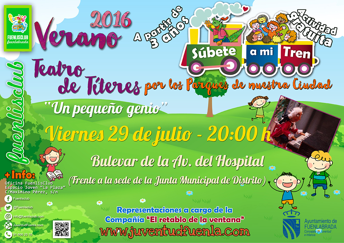 Súbete a mi Tren” es un programa de la Concejalía de Juventud e Infancia del Ayuntamiento de Fuenlabrada dirigido a niños, niñas y sus familias cuya finalidad es la de ofrecer actividades gratuitas de carácter participativo y cultural que combinen la diversión y el disfrute con la educación en valores y la sensibilización a través de la dinamización de espacios de referencia para la infancia de la ciudad. Este programa lo componen distintos vagones cargados de contenidos que simbólicamente se irán desplazando por la ciudad durante todo el año con más de 30 representaciones durante 2016.