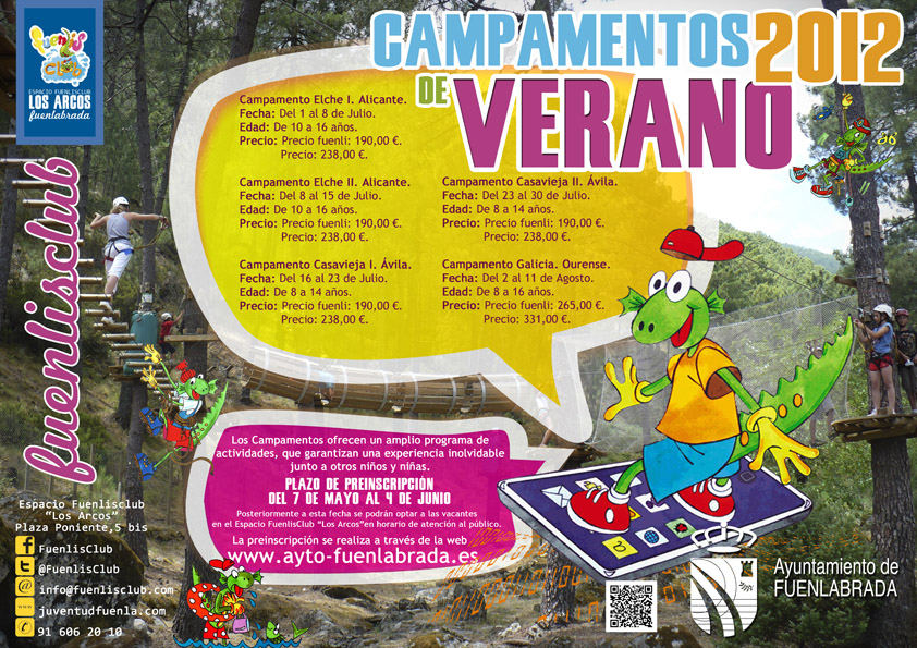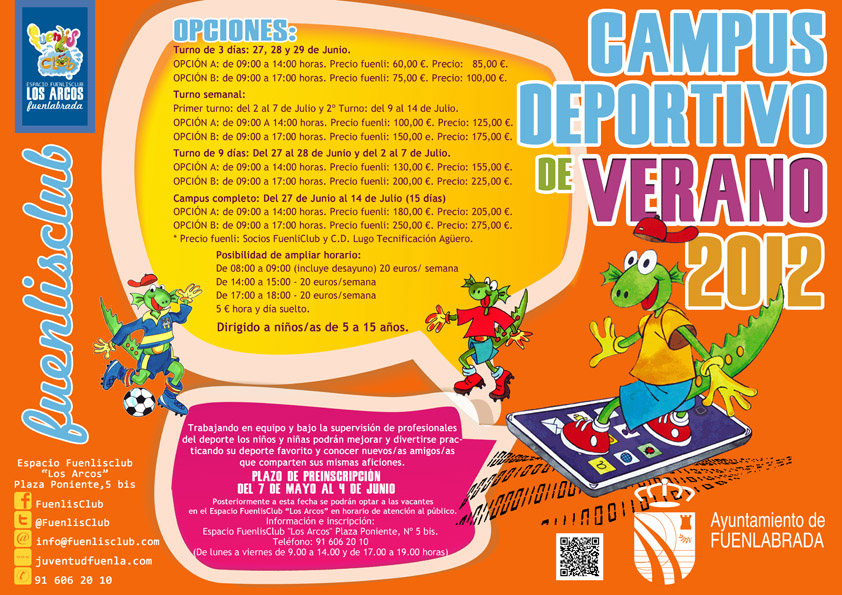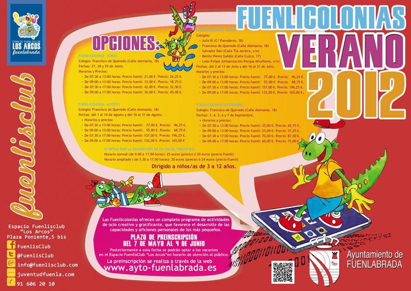 El Ayuntamiento de Fuenlabrada, a través de las Concejalías de Juventud e Infancia y de Educación, ofrece distintas alternativas durante las vacaciones veraniegas para niños y jóvenes con edades comprendidas entre 3 y 16 años. Fuenlicolonias Bilingües Play English de Verano, Campamentos y Campus Deportivo de Fútbol «Ciudad de Fuenlabrada».