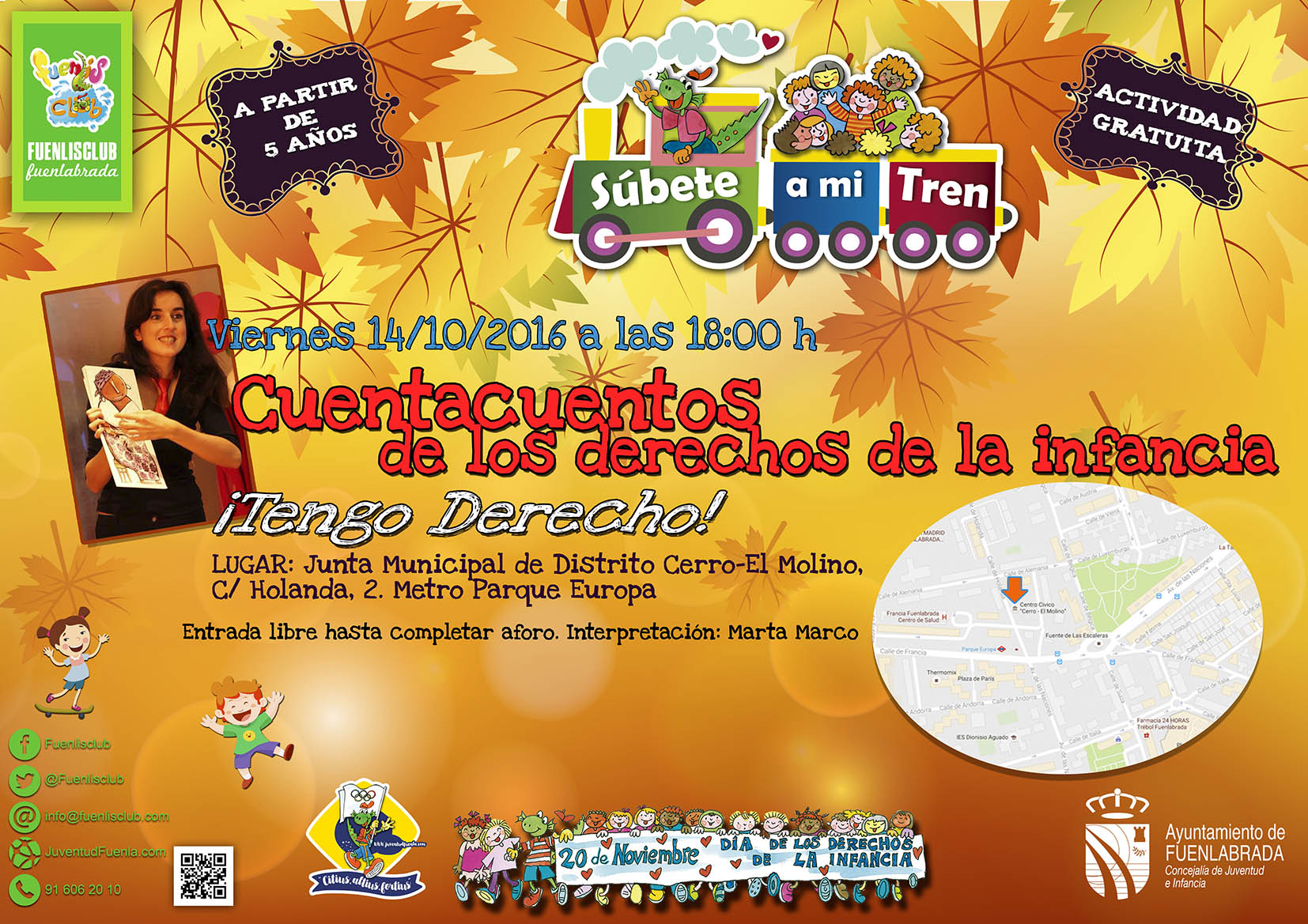 ¡Tengo Derecho! es el espectáculo elegido para esta nueva etapa de Súbete a mi Tren. En el mismo, la cuentista Marta Marco trata, de forma comprensible, cercana y divertida, algunos de los Derechos fundamentales de la infancia, ayudándose de magníficos cuentos, canciones y poemas. Historias que invitan a la reflexión, al respeto y la solidaridad tanto de las personas pequeñas como de las mayores. Actividad gratuita dirigida a niños y niñas a partir de 5 años.
