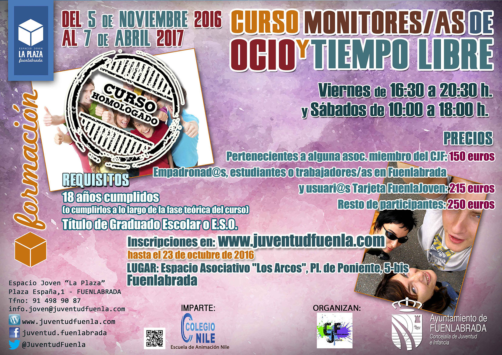 El curso está organizado en colaboración con el Consejo de la Juventud de Fuenlabrada, será impartido por la Escuela de Tiempo Libre del Colegio Nile y está destinado a jóvenes que quieran formarse para poder realizar una labor educativa con niños/as y jóvenes en el ámbito del tiempo libre. Las personas que quieran participar en esta acción formativa deberán estar en posesión del título de Graduado en ESO o Graduado Escolar y tener 18 años o cumplirlos antes de que finalice la parte teórica del curso.