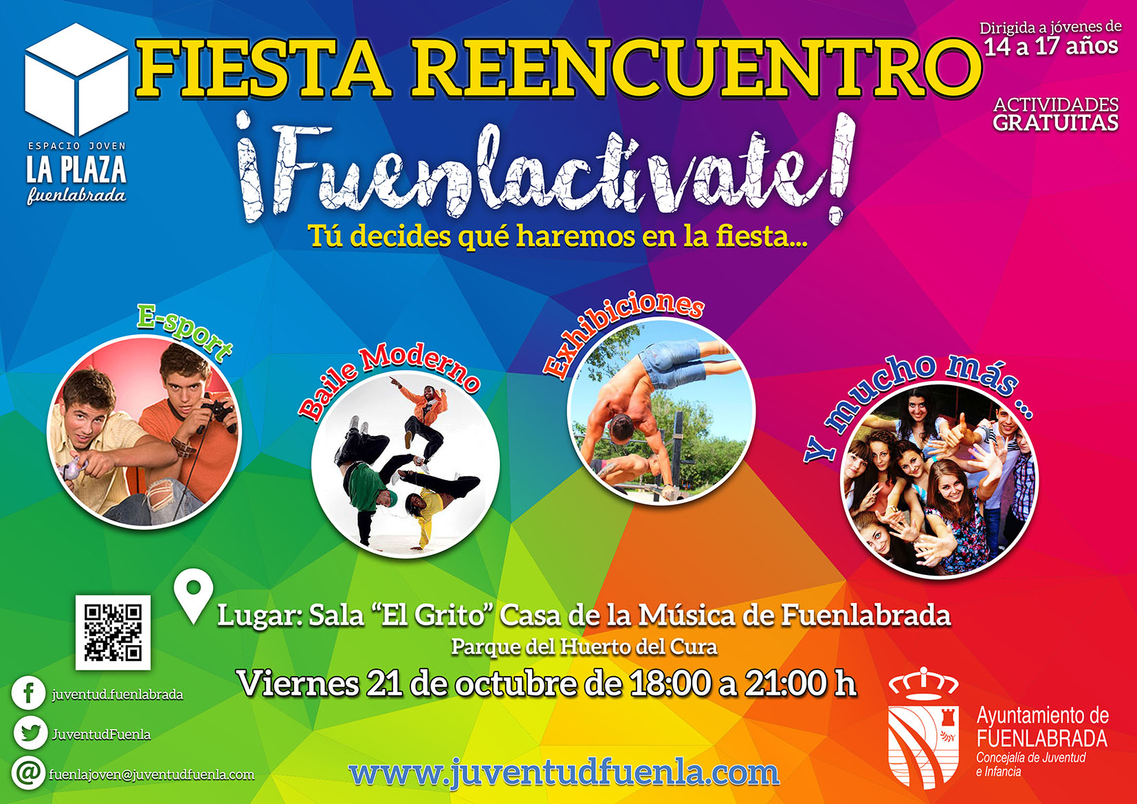 Después del verano la Concejalía de Juventud e Infancia vuelve a poner en marcha el proyecto Fuenlactívate, y lo hace invitándote a ti y a tus amigos/as a una fiesta el viernes 21 de octubre de 18:00 a 21:00h en la Casa de la Música de Fuenlabrada (Parque del Huerto de Cura).