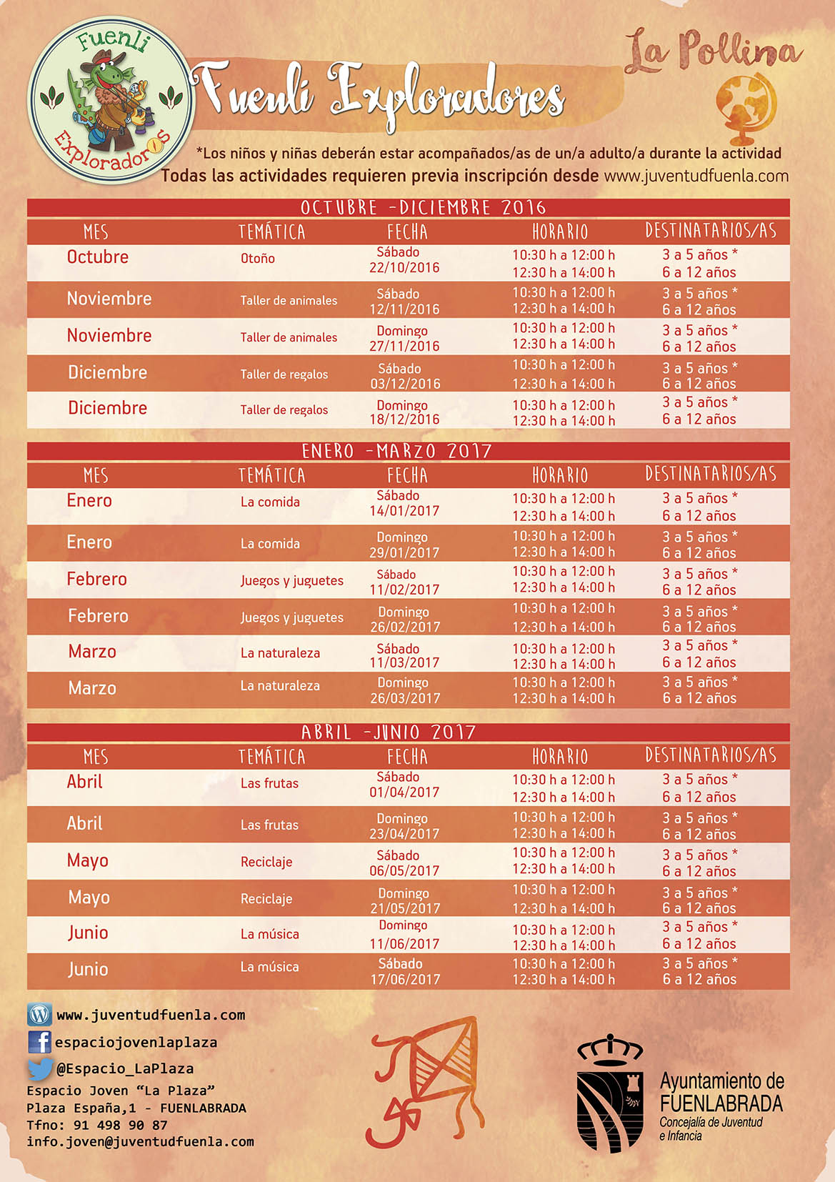 Durante este curso 2016/2017 los talleres estarán divididos por meses temáticos y las actividades se realizarán los sábados o domingos en horario de mañana.