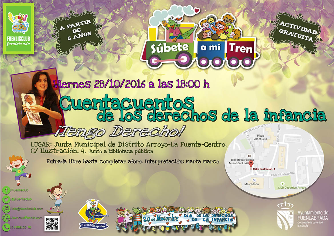 ¡Tengo Derecho! es el espectáculo elegido para esta nueva etapa de Súbete a mi Tren. En el mismo, la cuentista Marta Marco trata, de forma comprensible, cercana y divertida, algunos de los Derechos fundamentales de la infancia, ayudándose de magníficos cuentos, canciones y poemas. Historias que invitan a la reflexión, al respeto y la solidaridad tanto de las personas pequeñas como de las mayores. Actividad gratuita dirigida a niños y niñas a partir de 5 años.