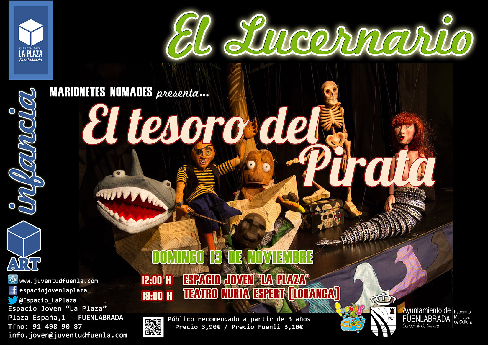 El domingo 13 de noviembre a las 12:00 h. una nueva edición de El Lucernario nos acerca al Espacio Joven «La Plaza» la obra de teatro de títeres «El Tesoro del Pirata» de la compañía Marionetes Nomades.