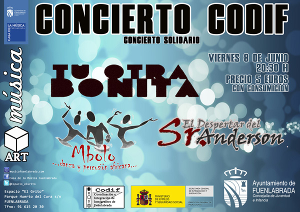 El próximo viernes 8 de Junio, CODIF (Coordinación e Integración de Inmigrantes de Fuenlabrada) celebrará un Concierto Solidario a las 20:30 horas en el Espacio el Grito de Fuenlabrada.