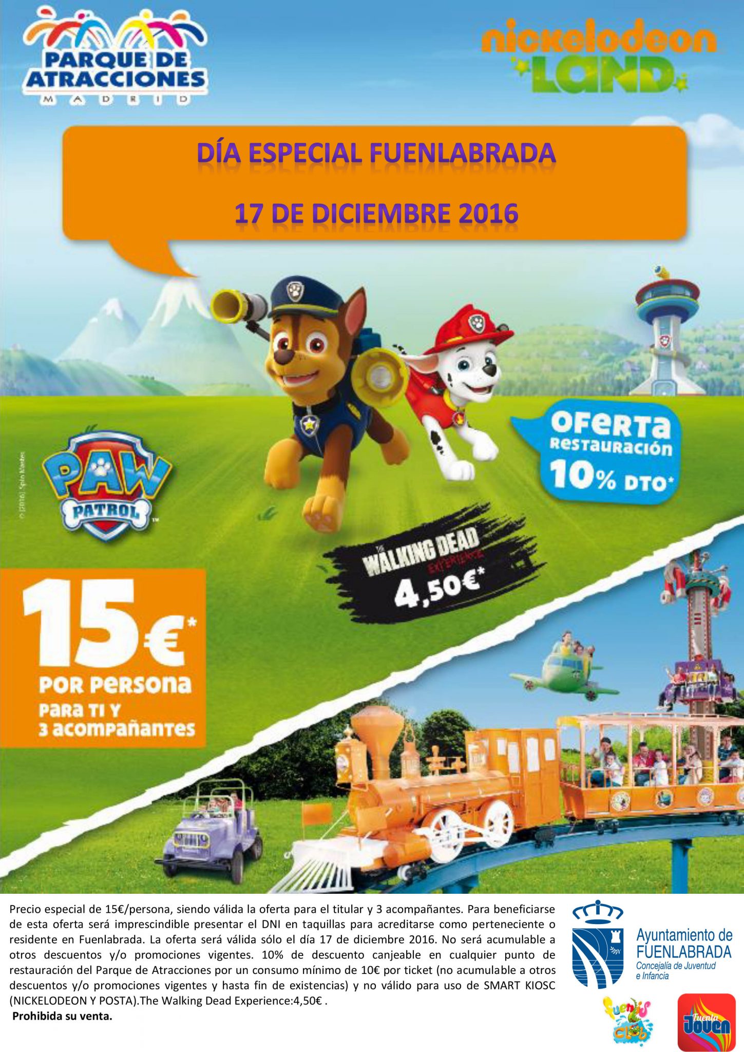 Durante ese día con sólo presentar el Carné Fuenli, la Tarjeta FuenlaJoven o el DNI (en cuyo caso, como lugar de residencia deberá aparecer Fuenlabrada) la persona que acredita ser del municipio y hasta 3 acompañantes, podrán entrar al recinto del Parque de Atracciones al precio único de 15 euros por persona.