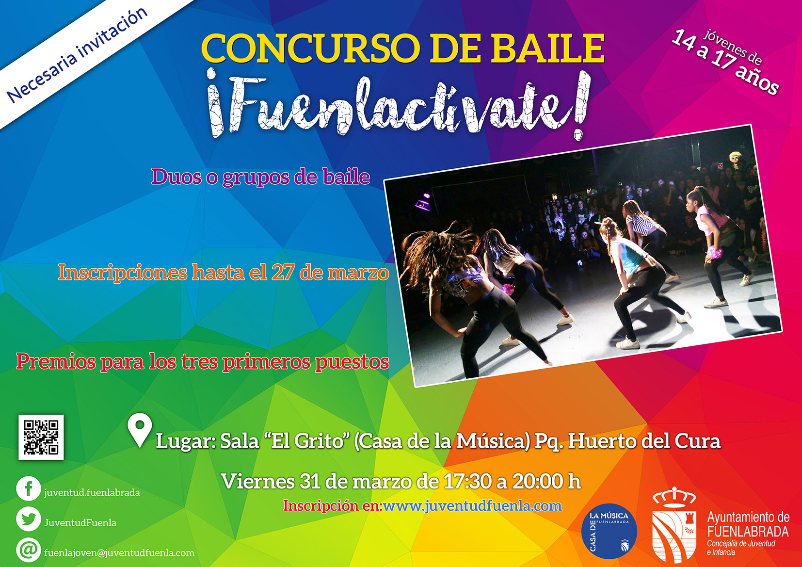 El concurso se celebrará el viernes 31 de marzo de 17:30 a 20:00h en la Sala «El Grito» de la Casa de la Música de Fuenlabrada (Pq. Huerto del Cura). Los/as componentes de los grupos de baile serán los/as encargados/as de repartir las invitaciones. Se premiarán a los tres grupos mejor puntuados: