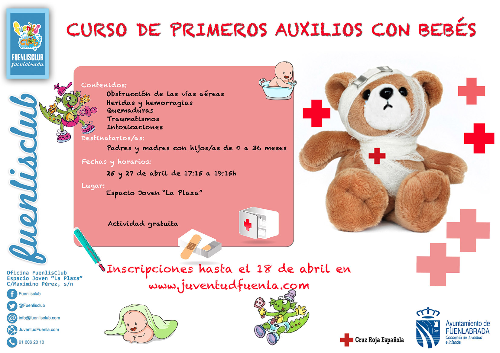 El curso se desarrollará en las instalaciones del Espacio Joven «La Plaza» y está dirigido a familias con bebés de hasta 36 meses de edad.Los días 25 y 27 de abril, la Concejalía de Juventud e Infancia ha organizado un curso de “Iniciación a los primeros auxilios en bebés” con contenidos mínimos para iniciarse en conceptos y técnicas básicas de primeros auxilios. Con este curso se pretende dotar a las familias, a través de una metodología eminentemente práctica, de los conocimientos, habilidades y destrezas básicas necesarias para dar una primera respuesta a situaciones de urgencias o emergencia de una forma eficaz.