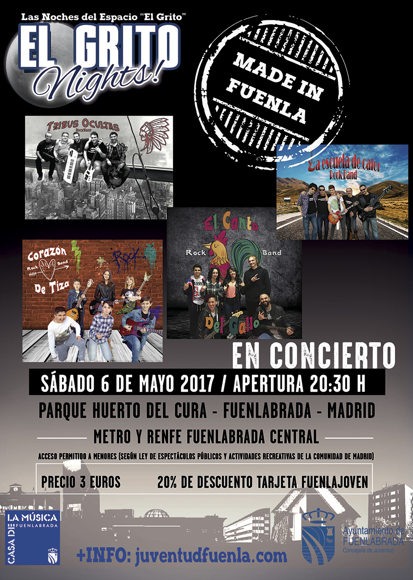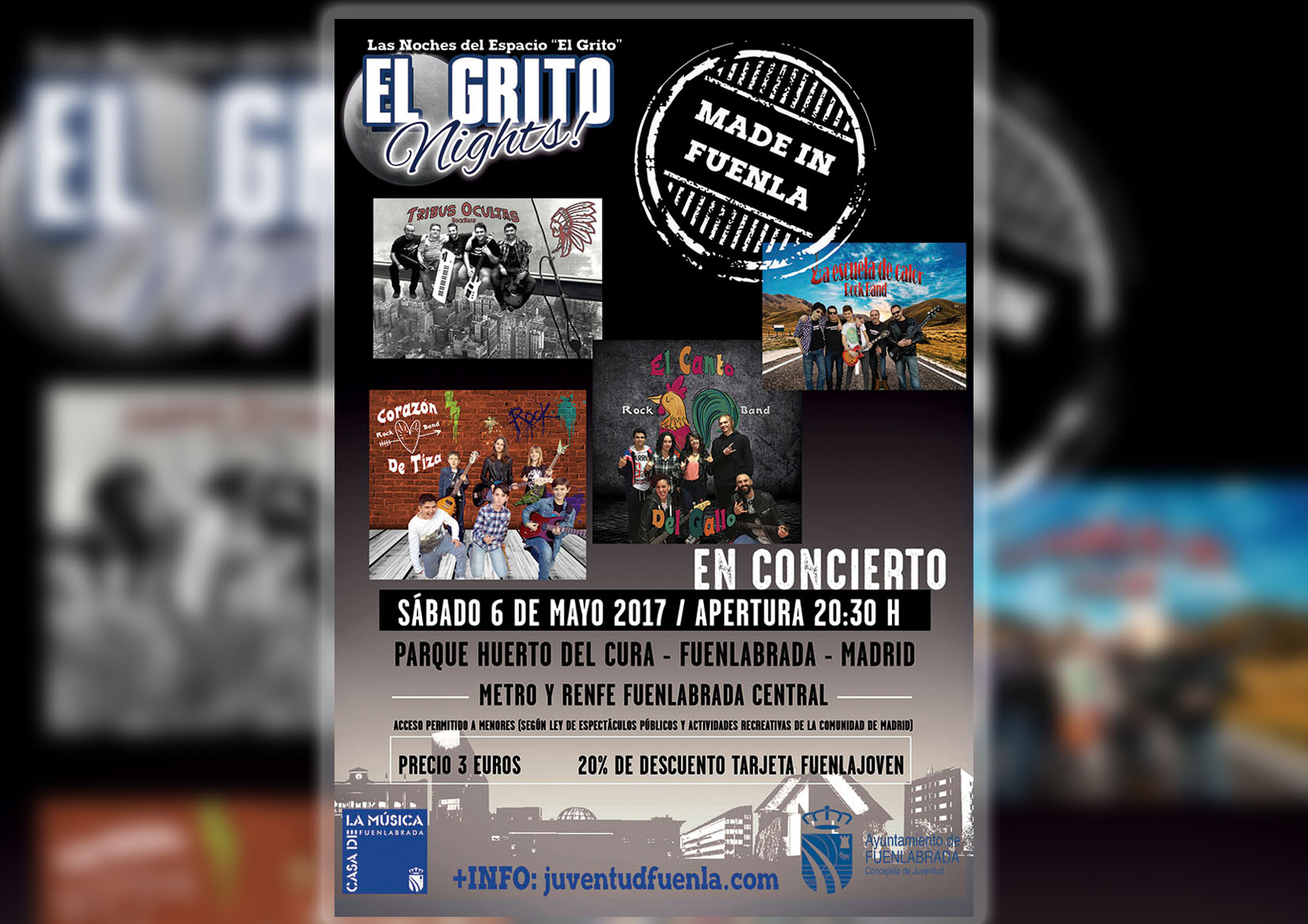 El sábado 6 de mayo a a partir de las 21:00h una nueva edición del «Grito Nights» con un concierto Made in Fuenla, en el que actuarán las bandas «Tribus Ocultas», » La Escuela de Calor», «Corazón de Tiza» y «El Canto del Gallo».