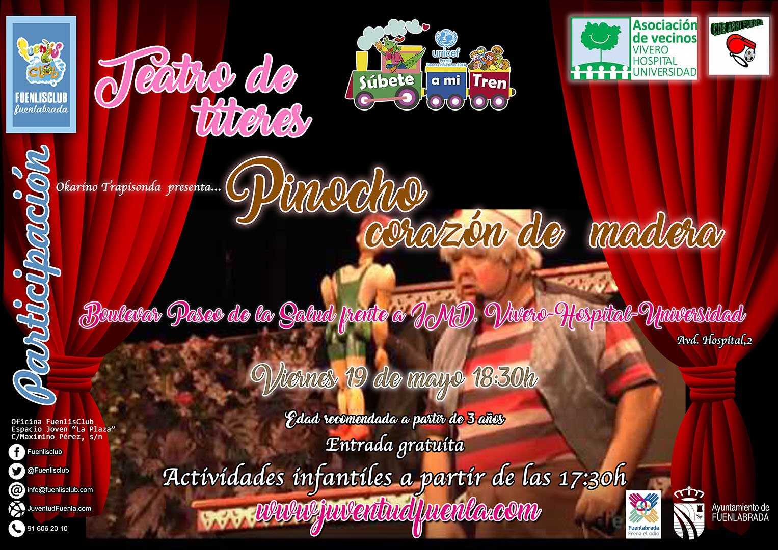 La compañía Okarino Trapisonda representará a partir de las 18:30h la obra de teatro de títeres «Pinocho corazón de madera». La extraordinaria historia de un muñeco que se hace niño, un títere que rompe los hilos que le atan para ser una persona. Su corazoncito de madera ha de trasformarse en un corazón de carne. Un gran número de títeres de diversas técnicas y tamaños y un gran trabajo de adaptación respetando el conocido relato de Collodi, subrayando la ternura y el disparatado humor de Pinocho. Obra muy tierna para público familiar recomendada a partir de los tres años.