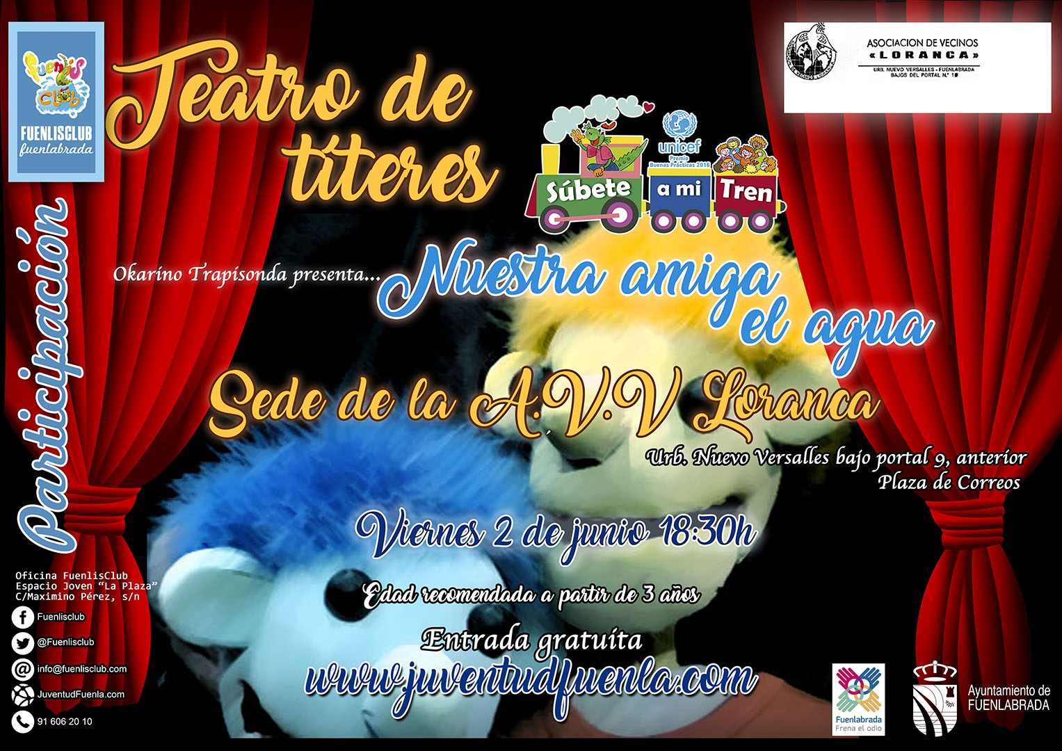 La compañía Okarino Trapisonda representará este viernes 2 de junio a las 18:30h la obra de teatro de títeres «Nuestra amiga el agua «. Una divertida obra de teatro de títeres en la que se cuentan las vicisitudes de la familia Cucudrulu, para organizar la fiesta de cumpleaños del Cucudrulito. La señora Cucudrula está muy contenta y prepara con ilusión la gran fiesta de cumpleaños de su pequeño. El señor Cucudrulu también colabora, pero es un desastre, pues olvida comprar el regalo y repartir las invitaciones a los/as compañeros/as de Cucudrulito. Y es tan comilón que se “zampa” todos los pinchitos que había elaborado la señora Cucudrula. Todo esto en un ambiente divertido y donde el humor y la fiesta son el principal protagonista.