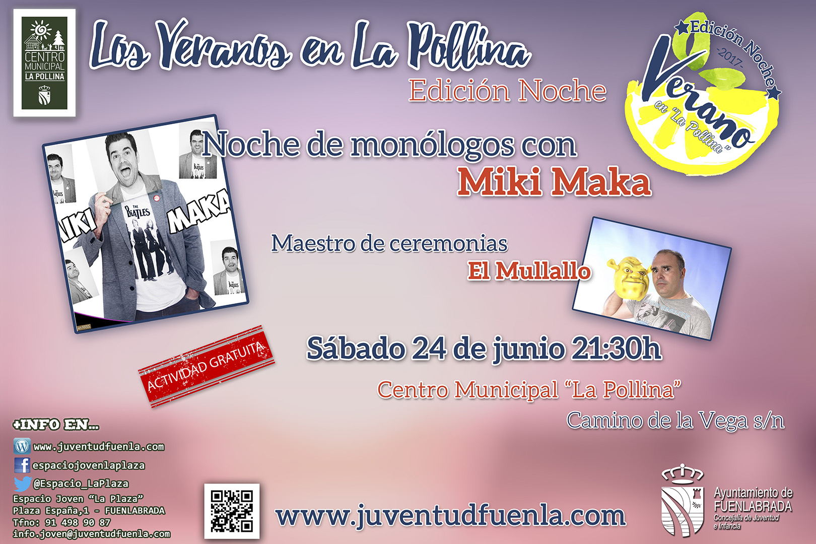 Miki Maka un cómico de Puertollano con un humor ágil, ácido y macarra, que no te deja ni pestañear. Es una metralleta sobre el escenario, donde le gusta poner los puntos sobre las íes con altas dosis de ironía y exageración. Miki forma parte del equipo de colaboradores de la Jungla de Jose Antonio Abellán en Radio 4g, anteriormente estuvo en Radio Marca y Radio Intereconomía,descubierto en 2012 por Comedy Central, donde participó en el programa “Open Mike” hablando de lo mal repartido que está el mundo. En 2014 estrena su primer monologo en Central de Cómicos, donde desgrana una de sus grandes pasiones: la música, Miki es bastante melómano y hay ciertas cosas de la industria musical que él cree que deberían cambiarse, en tele también participó en la goleada de 13tv y en el programa de la Sexta de Andreu Buenafuente en el Aire.