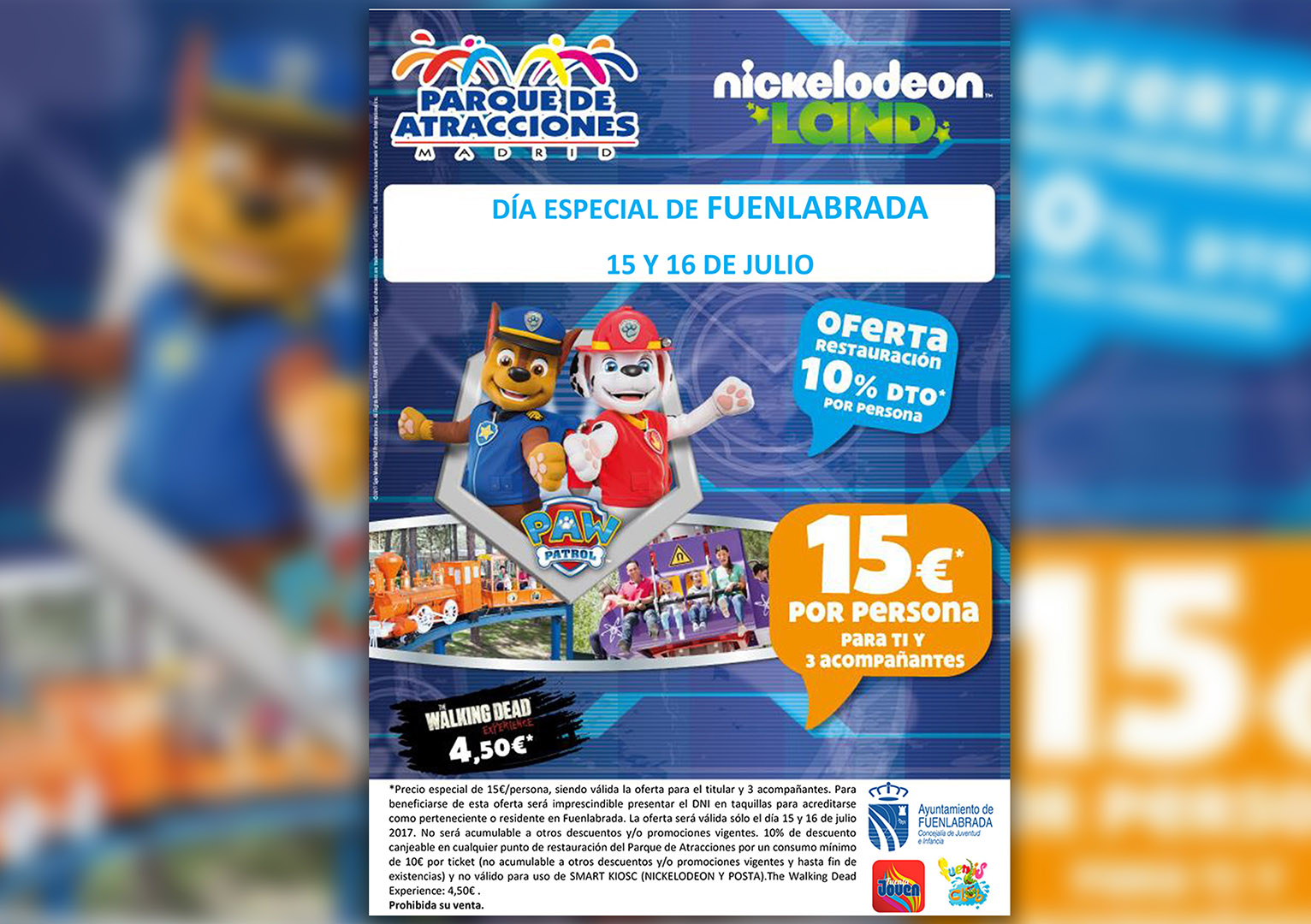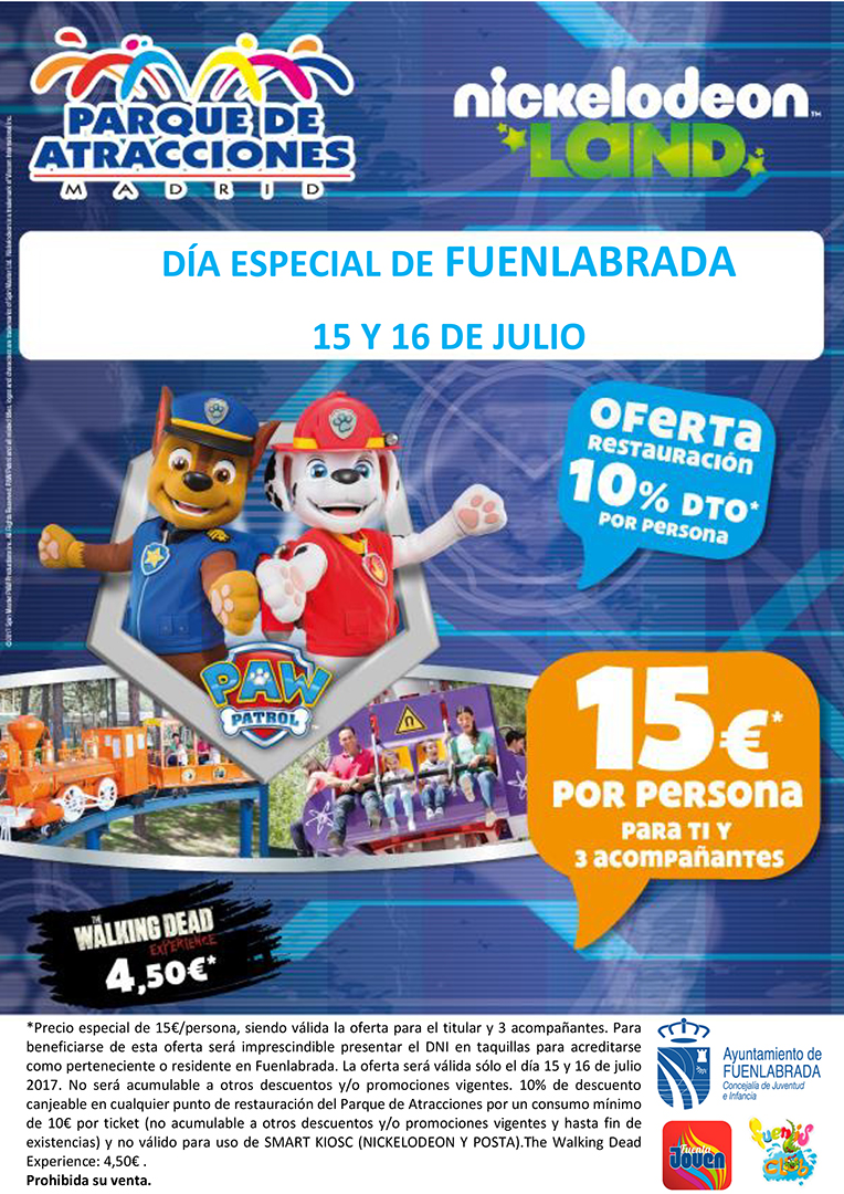 Durante estos días con sólo presentar el Carné Fuenli, la Tarjeta FuenlaJoven o el DNI (en cuyo caso, como lugar de residencia deberá aparecer Fuenlabrada) la persona que acredita ser del municipio y hasta 3 acompañantes, podrán entrar al recinto del Parque de Atracciones al precio único de 15 euros por persona.