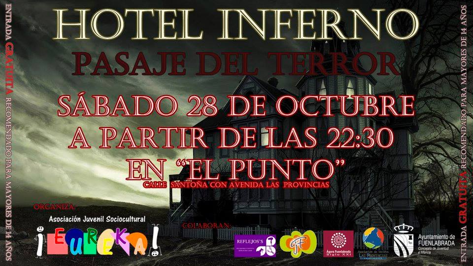 La Asociación Eureka Sur con la colaboración de Ágora Fuenlabrada Siglo XXI, el Consejo de la Juventud de Fuenlabrada y la Asociación de Vecinos Las Provincias organiza el pasaje del terror «Hotel Inferno» en su sede ubicada en el Espacio Asociativo «El Punto» (C/Santoña) el sábado 28 de octubre a partir de las 22:30 h.