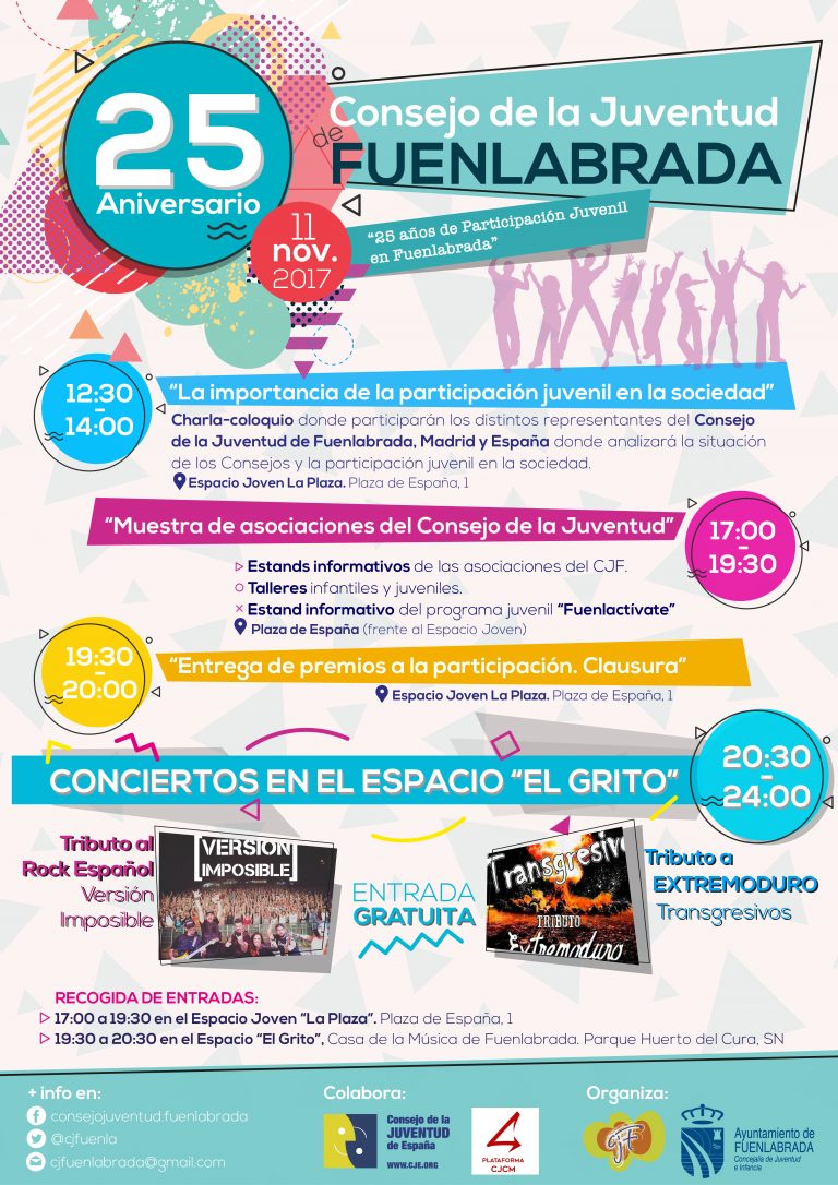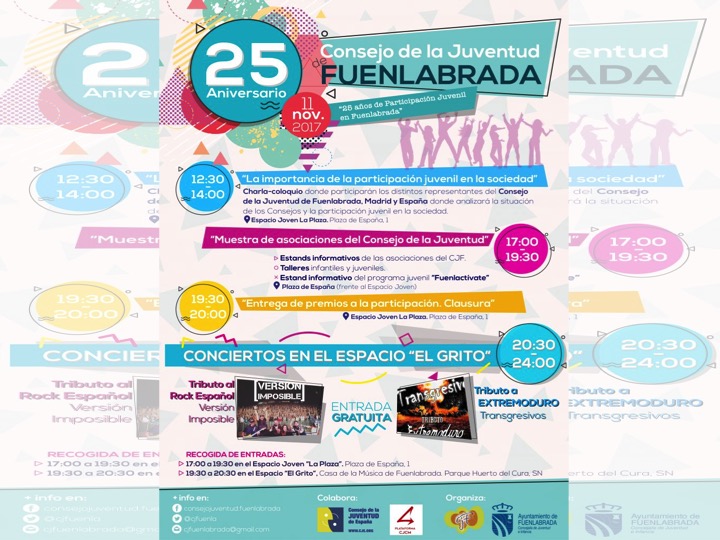 El sábado 11 de noviembre el Consejo de la Juventud de Fuenlabrada celebra su XXV Aniversario con un gran evento que se desarrollará en las instalaciones del Espacio Joven “La Plaza” y de la Casa de la Música de Fuenlabrada.