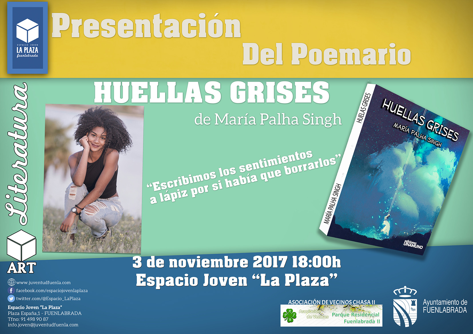 El próximo viernes 3 de noviembre a las 18:00 horas la joven escritora María Palha Singh presentará en el Espacio Joven «La Plaza» su poemario «Huellas Grises».La presentación se llevará a cabo en la Sala de las Artes del Espacio Joven «La Plaza» (Plaza de España, 1), dará comienzo a las 18:00h.
