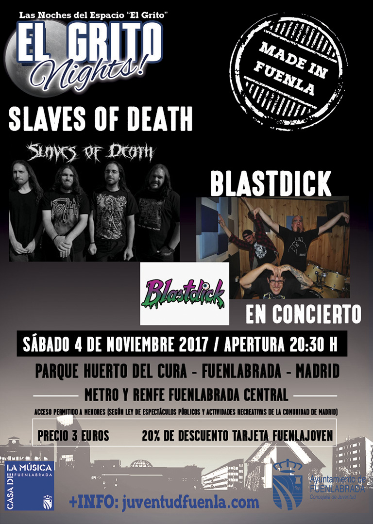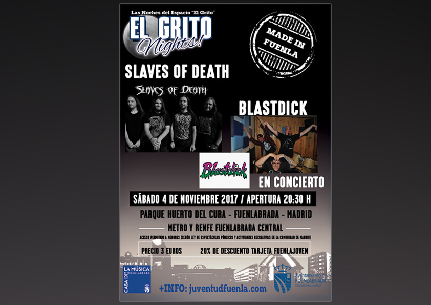 El sábado 4 de noviembre a a partir de las 21:00h una nueva edición del «Grito Nights» con un concierto Made in Fuenla, en el que actuarán las bandas locales Slaves of Death y Blastdick..