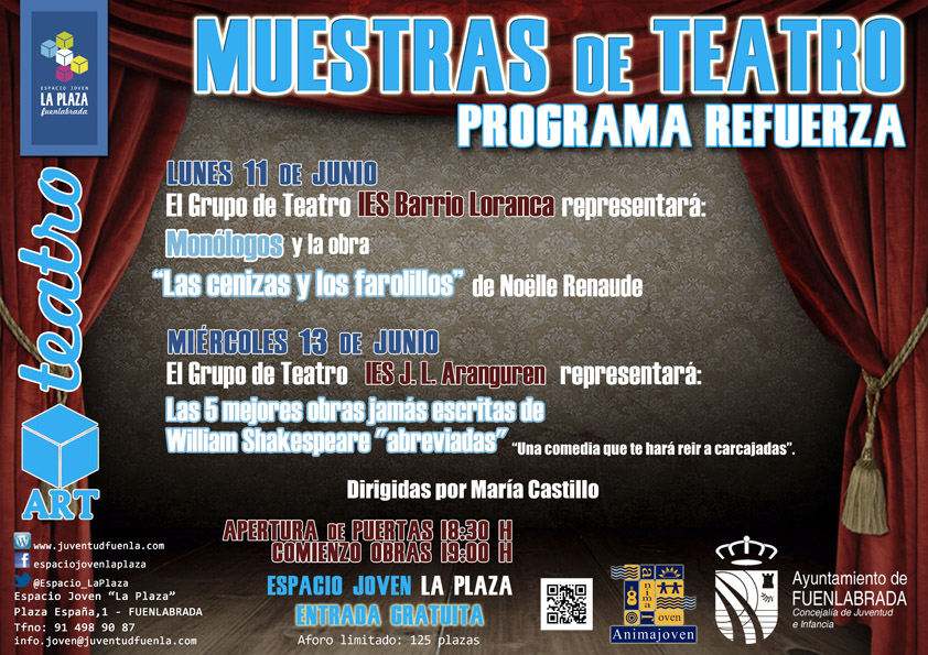 Los grupos de teatro de los IES de Fuenlabrada Barrio de Loranca y J.L. Aranguren representarán dos obras de teatro y monólogos en el Espacio Joven La Plaza la semana que viene, concrétamente los días 11 y 13 de Junio. Estas representaciones se hacen bajo la denominación “Muestras de Teatro” , como colofón del trabajo desarrollado por los talleres del “Programa Refuerza” de ANIMAJOVEN y los mencionados IES.La apertura de puertas será a las 18:30 y el inicio de las obras será a las 19:00 para ambas fechas.
